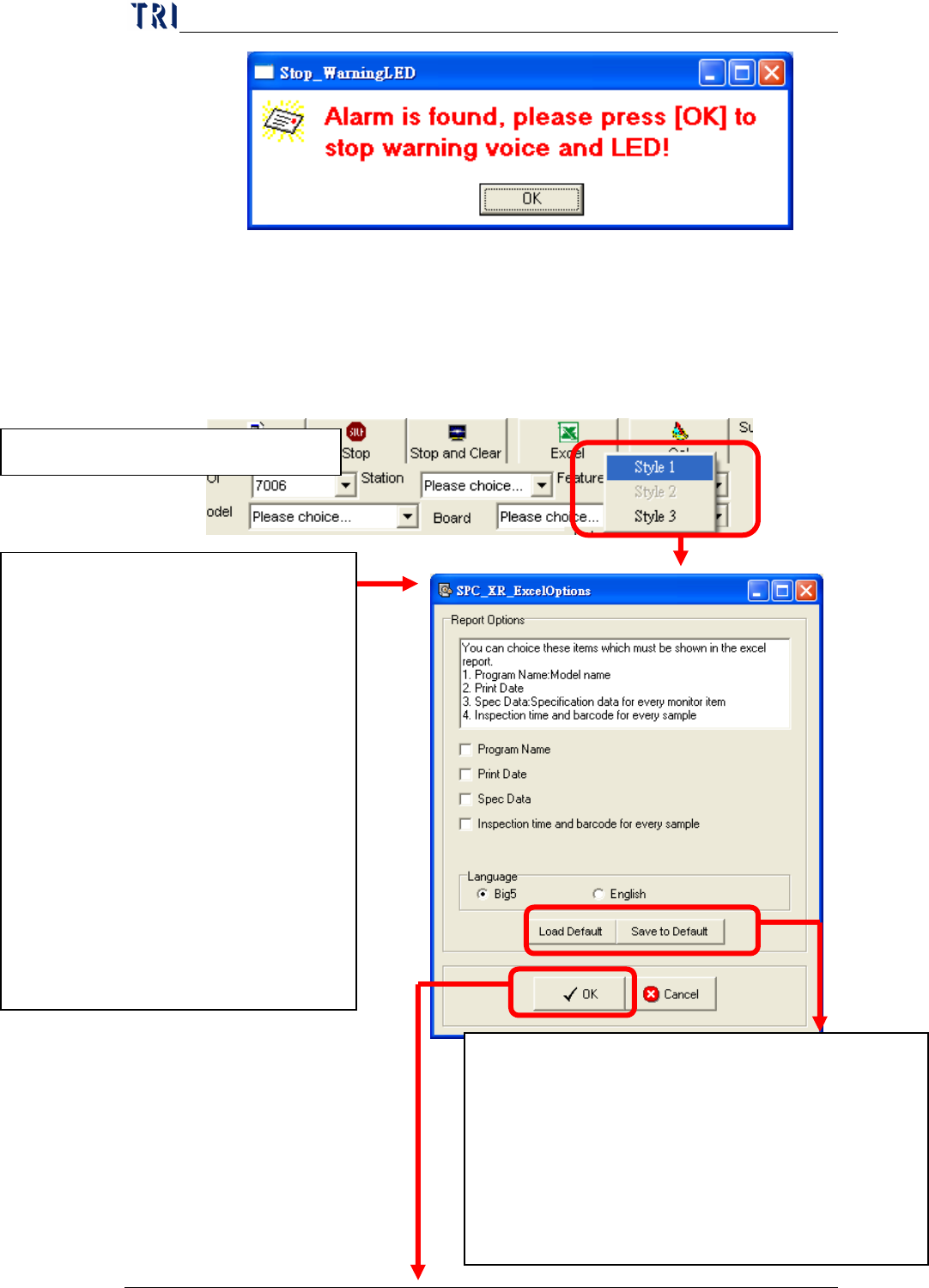 Chap ter3 SPC User Ma nual AOI Repair Station 142 If user has enabled the “Link to W arning LED” function, s y stem will display this warning window and the signal tower linked to P C will alarm and light up. User coul…