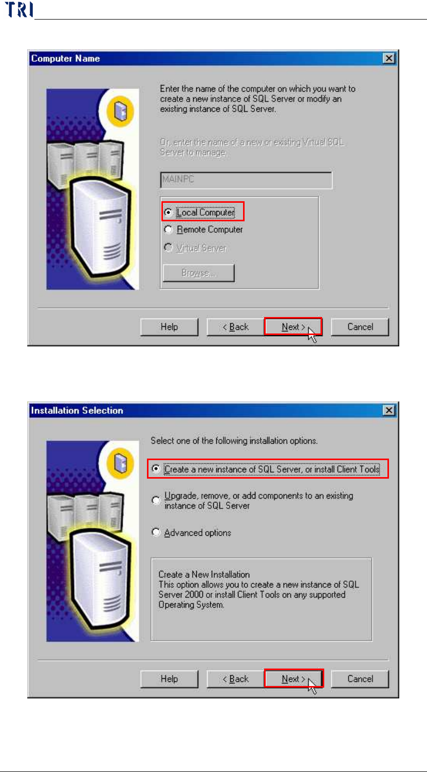 Chapter 1 Installation Pr ocess AOI Repair Station 12 d. Select [Local Computer]. e. Select [Create a new instance of SQL Server , or install Client T oo ls], Click [Next].