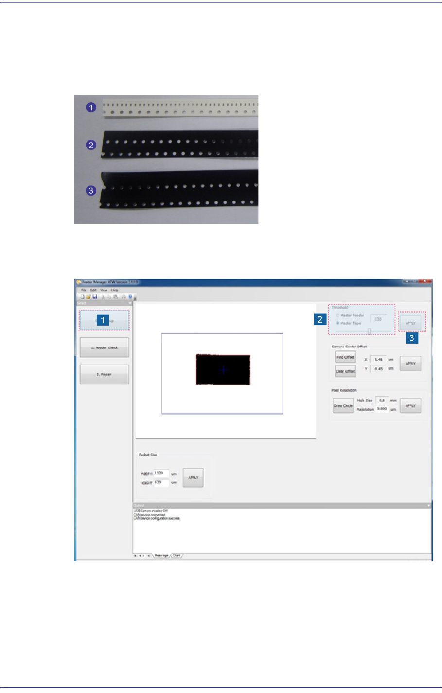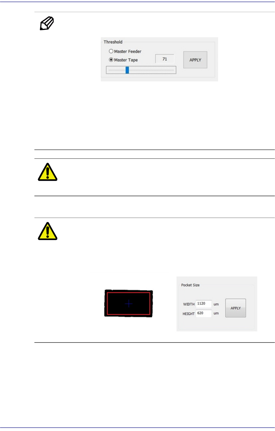 4-8 User's Guide For SME Feed er Calibration Jig 便 笺 Threshold 的设置方 式 <Master F eeder> 选项按钮 视觉系统识别主供料器的孔时选择。 <Master T ape > 选项按钮 请在观察系统识别插入在需要矫正的进料器上的标准带 ho le 或虚拟带的 po c ket 外角 时 进行选择。 注 意 根据 Th re…