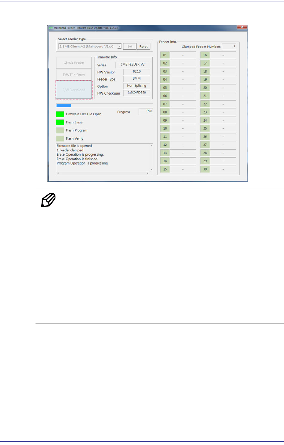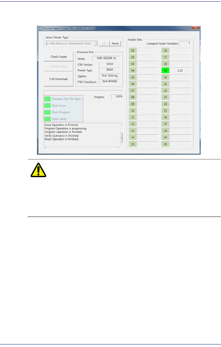 5-13 安装程序 7. 带式供料器的固件升级完毕后, 确认程序的状态指示领域是否全部亮绿灯, 然 后从供料器底座拆下带式供料器。 注 意 在带式供料器的固件升级过程中关闭带式供料器的电源的话, 可 能会让带式供料器的主机板遭受严重损伤。 在固件升级过程中严禁关闭带式供料器的电源。 否则 将视为使用 者失误所导致的主机板损伤, 本公司将不负任何责任。 发生问题时, 请联系本公司的 C/S 。