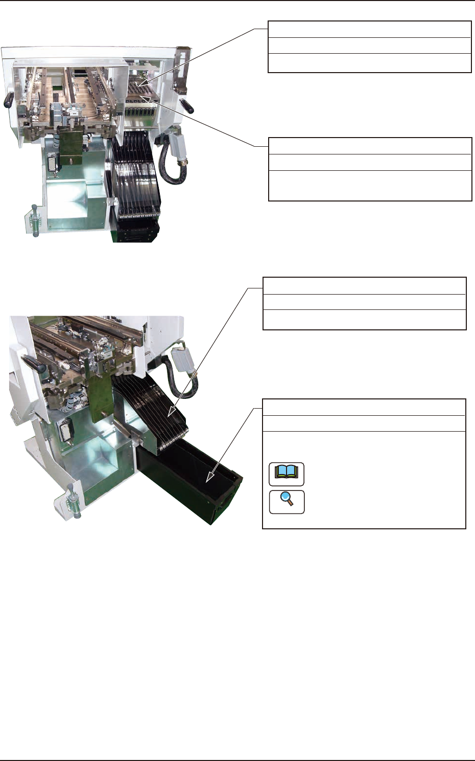 OM-1755 4-20 • 料盘拉钩保护盖的拆卸 Procedure (1) 将多段供料器复位到原点。 (2) 切断电源。 (3) 用十字螺丝刀拧下固定螺丝钉 (M3L4)(2 处 )。 警告 进行维护保养作业时,请拉下电闸后锁上挂锁。 料盘拉钩保护盖 FD14 • 维护保养盖的安装 请按照与拆卸料盘拉钩保护盖的相反步骤安装维护保养盖。 注意 结束维护保养后,请安装机盖。 1305-001 3.2 点检、清扫、注油处