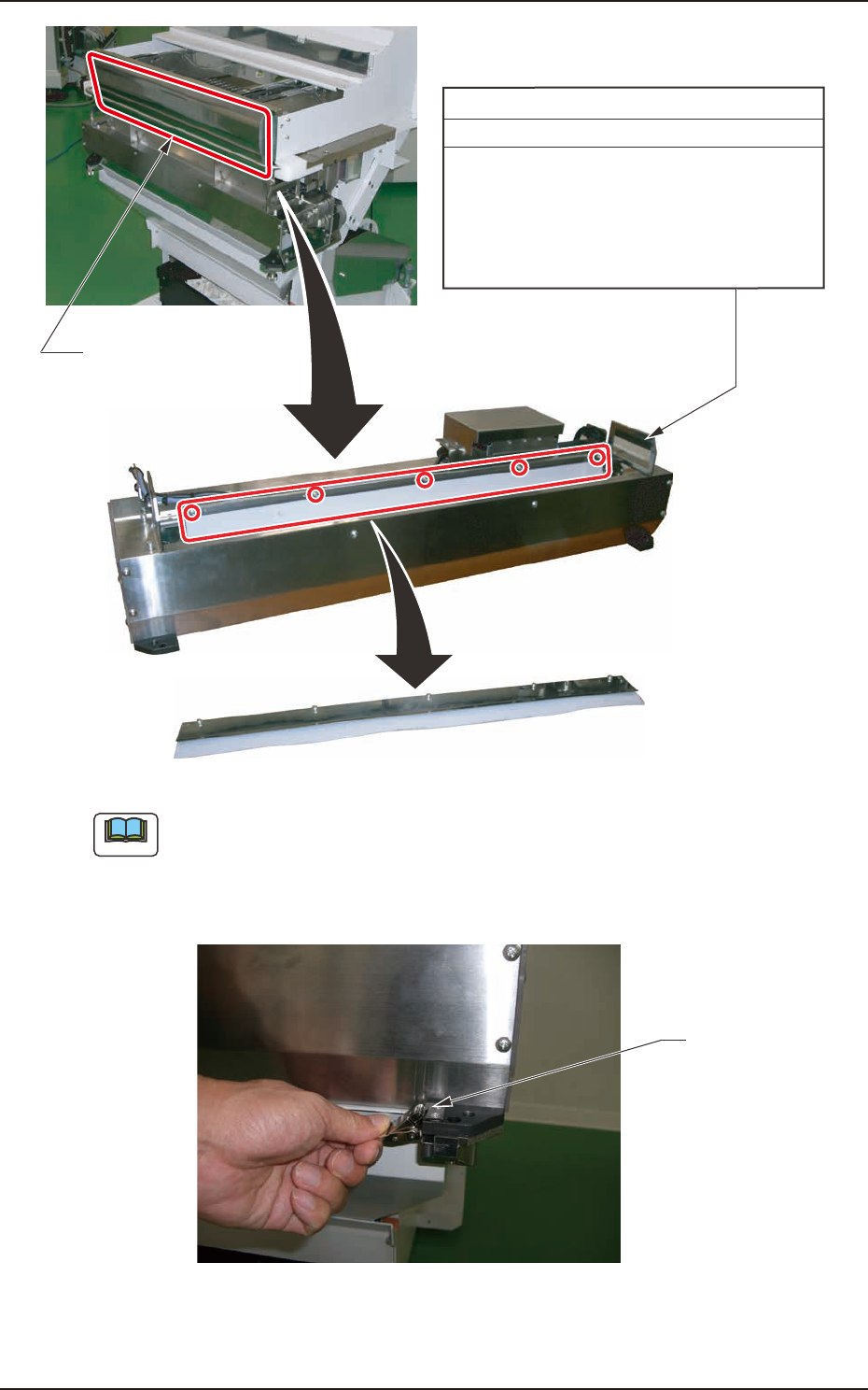 OM-1755 4-25 氟片 每年 更换 所要时间:15分钟 (1)请拆卸前安全盖,从推车卸下切割器。 (2)卸下料带引导槽。 (3)拧下5个螺丝钉。 (4)请更换氟片。 前安全盖 锁扣 拆卸的氟片 (a) 将切割器放到推车时,请牢牢固定2处连接器。 (b) 将切割器放到推车时,请将切割器推入到底,用锁扣(2处)牢牢固定。 (C) 请不要忘记安装安全盖。 FD20 1305-001 3.2 点检、清扫、注油处 Note