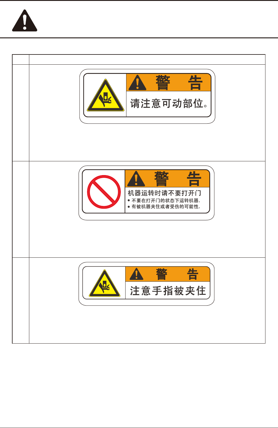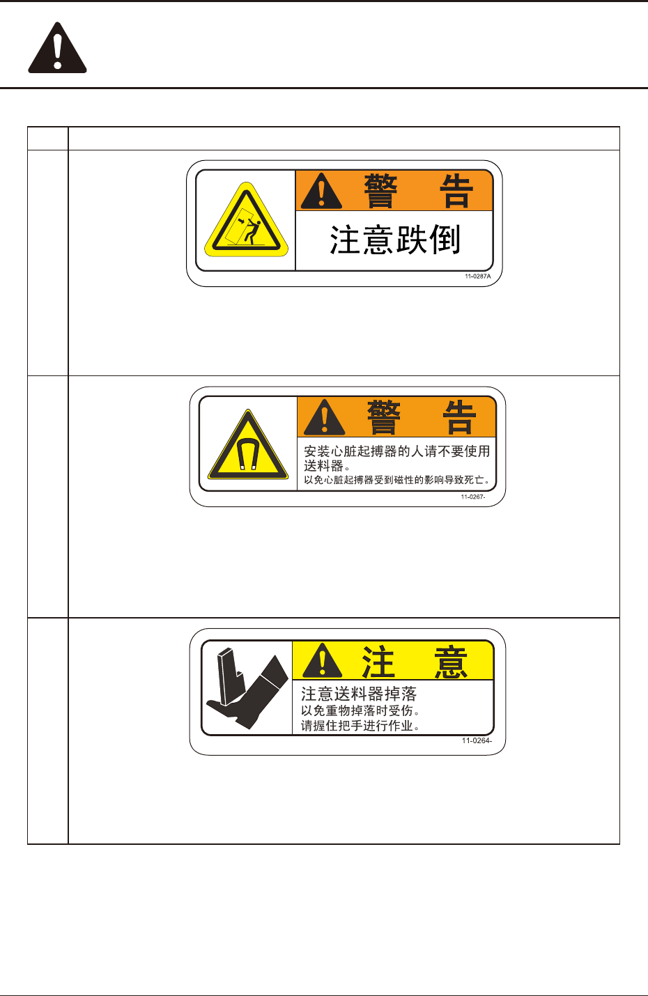安全 -14 为了使用上的安全起见 OM-1755 1305-001 5. 本装置的警告标签 No 警告标签及其说明 (7) 说 明 移动升降机单元时请注意地面的倾斜、段差。 地面坡度在 10/1000mm 以上时,会导致升降机倒塌重大事故。 (8) 说 明 带式送料器的料带传送部、封口盖带卷绕部使用永久磁铁。安装心脏起搏器 的人请不要使用带式送料器。 心脏起搏器会受到磁性的影响导致重大事故。 (9) 说 明 送料器掉落可能…