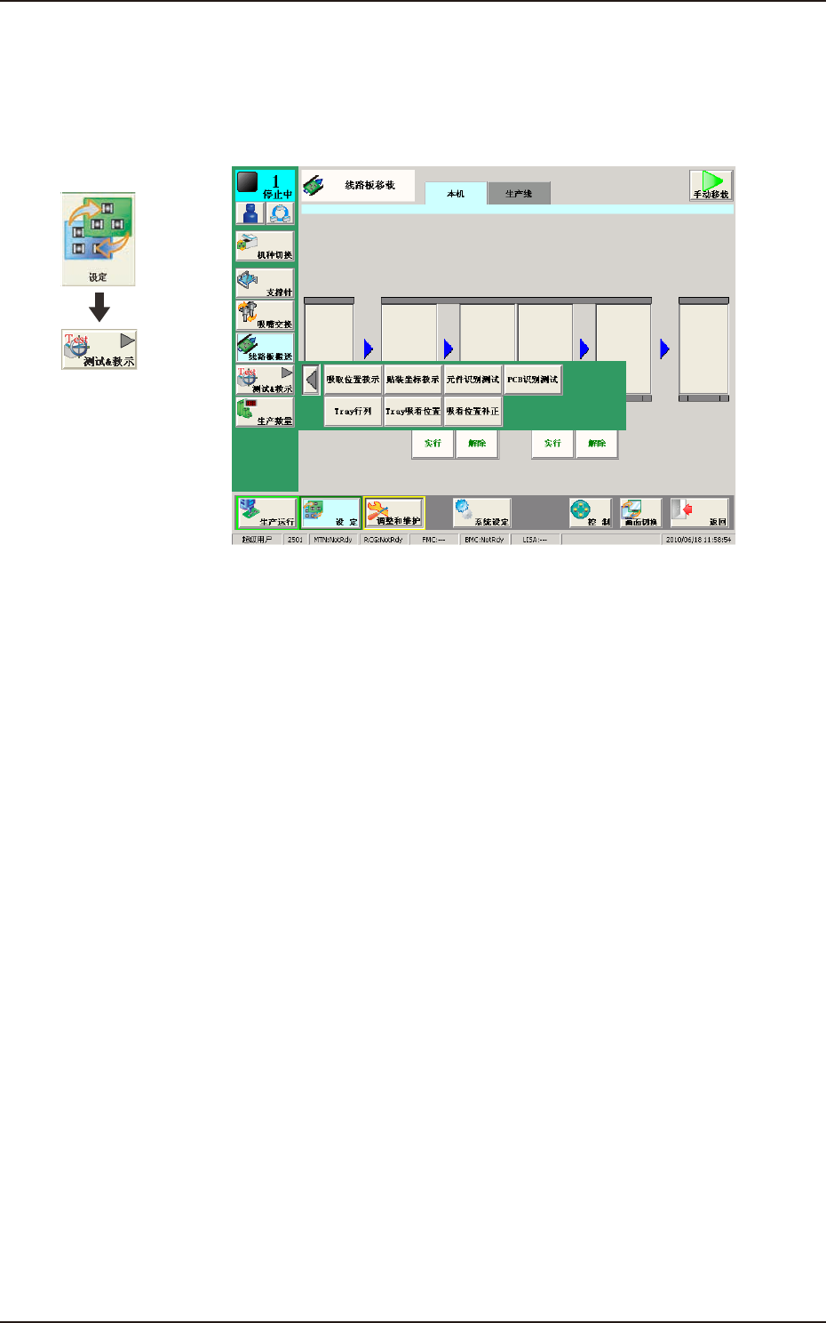 OM-1755 2-28 1305-001 3.2 测试 & 教示 3.2 测试 & 教示 进行 Tray 行列 ( 多段供料器阵列 )、Tray 吸着 ( 吸取 ) 位置以及吸着位置补 正的测试和教示。 测试 & 教示 FB27 界面展开