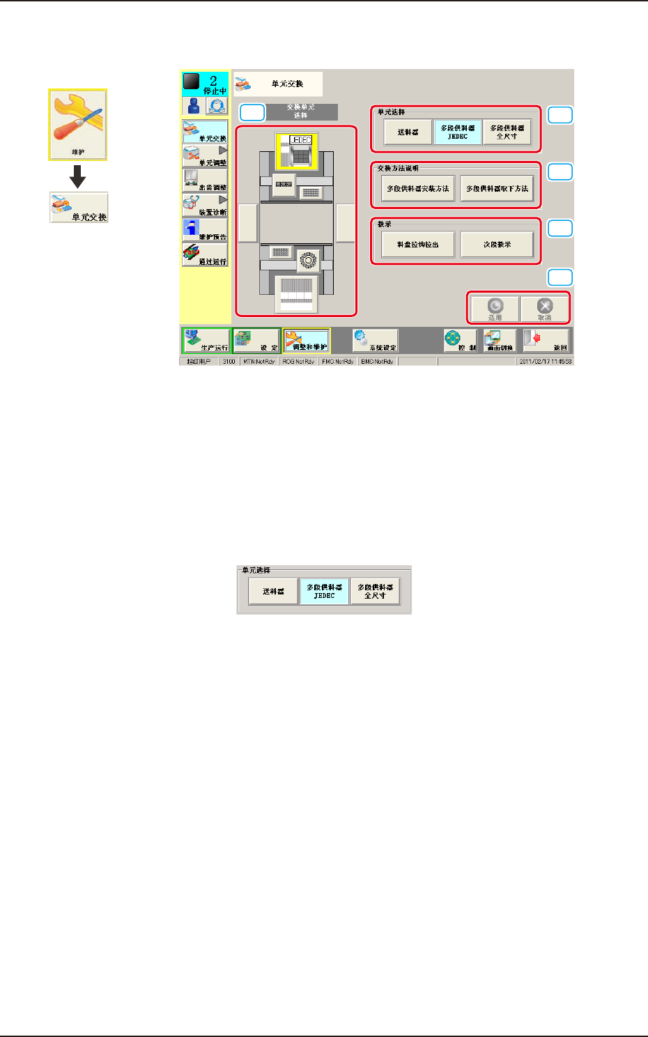 OM-1755 3-1 1305-001 1. 维护菜单 1.1 维护菜单概要 维护菜单由以下子菜单及界面构成。 Note 涂成灰色的部分是有关多段供料器的项目。  维护菜单 单元交换 单元调整 吸嘴交换 传送带 装置诊断 输入输出 马达 识别 通信状态 软件信息 生 产(出 厂)调 整 参照项目号 1.2 1.4.1 1.4.2 线性传感器 1.3 1.4 1.4.3 维护菜单概要 FC1 1. 维护菜单