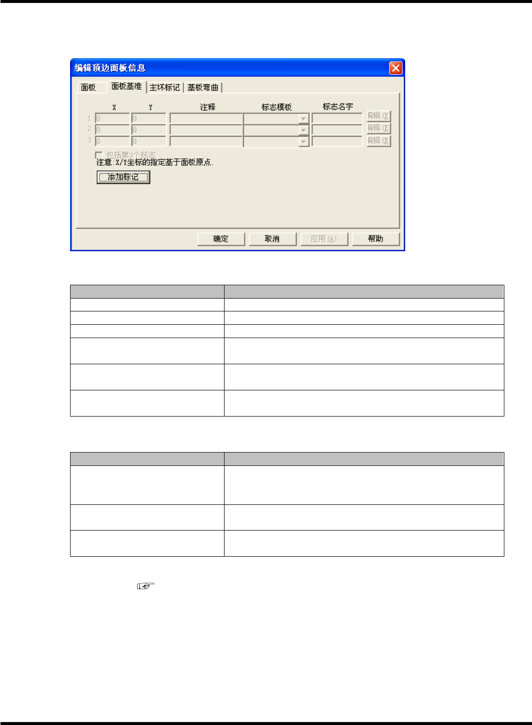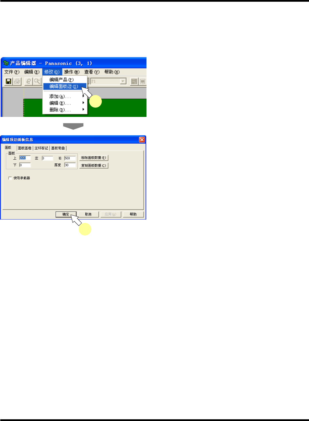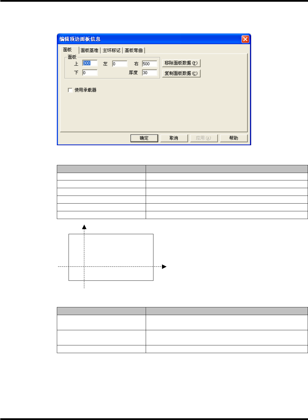 NPM-DGS 程序手册 5.5 PCB 编辑 EJS9AC- MB-05 P-02 Page 5- 51 ① ‘ 面板 ’ 标签 在 ‘ 面板 ’ 标签上设定基板的尺寸等。 设定项目 项目 说明 ‘ 上 ’ 基板的 Y 方向上端的坐标 ‘ 下 ’ 基板的 Y 方向下端的坐标 ‘ 左 ’ 基板的 X 方向左端的坐标 ‘ 右 ’ 基板的 X 方向右端的坐标 ‘ 厚度 ’ 基板的厚度 ‘ 使用承载器 ’ 使用承载器时,在本项复选框中打勾…