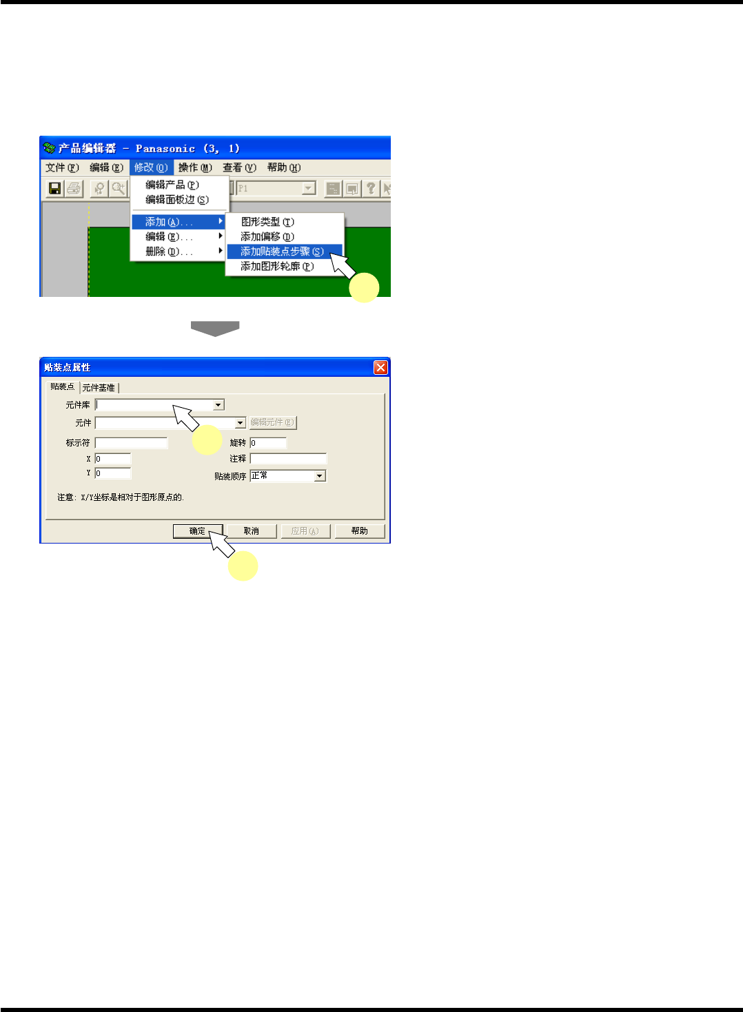 NPM-DGS 程序手册 5.5 PCB 编辑 EJS9AC- MB-05 P-02 Page 5- 55 5.5.2 添加实装点 在 < 贴装点属性 > 画面上,进行实装点的添加和编辑。 添加实装点 1. 选择菜单栏的 [ 修改 ] → [ 添加 ] → [ 添加贴 装点步骤 ] 。 • 将会显示 < 贴装点属性 > 画面。 2. 设定与实装点有关的信息。 3. 单击 [ 确定 ] 。 1 3 2