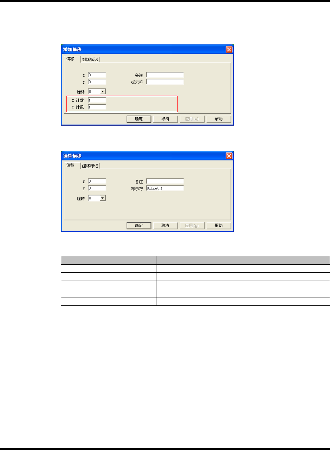 NPM-DGS 程序手册 5.5 PCB 编辑 Pa ge 5-64 EJS9AC-MB- 05P-02 仅在添加时显示出来的设定项目 ( 用框框住的部分 ) 项目 说明 ‘X 计数 ’ 将多个偏移量同时添加 到 X 方向时,设定本字段。输入添加到 X 方向的图形数量。 ‘Y 计数 ’ 将多个偏移量同时添加 到 Y 方向时,设定本字段。输入添加到 Y 方向的图形数量。 ‘X 间距 ’ 将多个偏移量同时添加 到 X 方向时,设定本字段…
