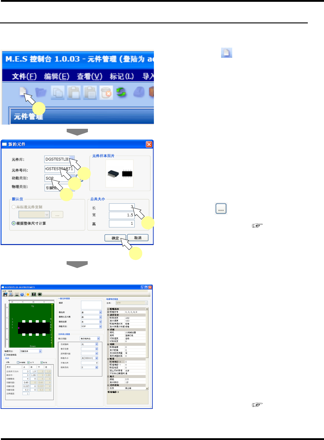 NPM-DGS 程序手册 6.3 添加新的元件 Pa ge 6-4 EJS9AC-MB-06P- 02 6.3 添加新的元件 添加新的元件 1. 单击工具栏的 或选择菜单栏的 [ 文 件 ] → [ 创建 ] 。 • 将会显示 < 新的元件 > 画面。 2. 选择元件库。 3. 输入元件号码。 4. 输入功能类别。 • 单击右侧的 ,将会显示功能类别的 图片。 • 关于功能类别的详细内容 : ‘6.3.2 功能类 别图片…
