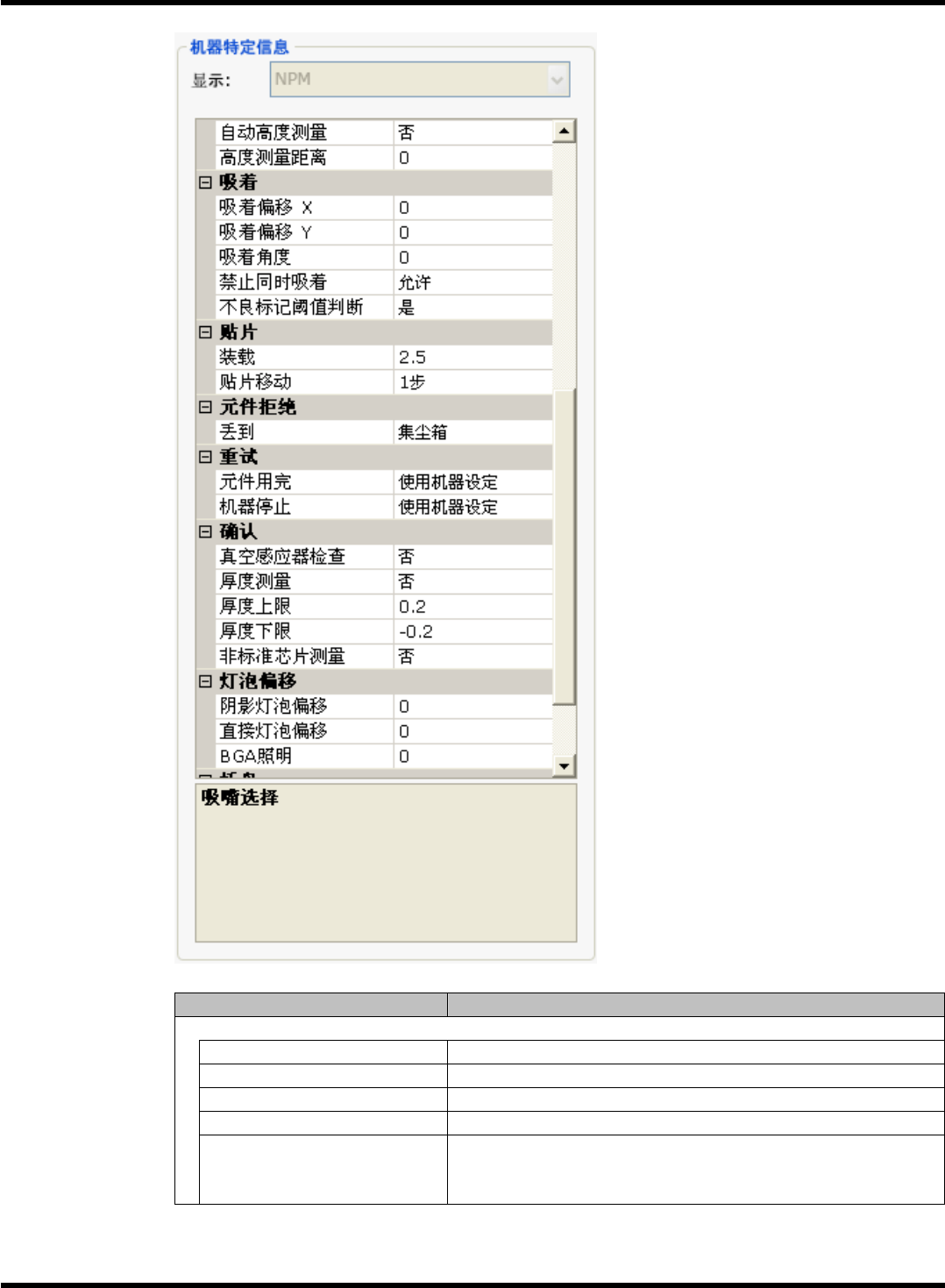 NPM-DGS 程序手册 6.3 添加新的元件 EJS9AC- MB-06 P-02 Page 6- 19 项目 说明 ‘ 吸着 ’ ‘ 吸着偏移 X’ 偏离平时吸着位置的 X 方向偏移量。 ‘ 吸着偏移 Y’ 偏离平时吸着位置的 Y 方向偏移量。 ‘ 吸着角度 ’ 在吸着时吸嘴旋转的角度。 ‘ 禁止同时吸着 ’ 设定是否抑制同时吸着。 ‘ 吸着位置学习 ’ 设定是否进行吸着位置学习和自动调整。 ∗ 使用在吸嘴库被设定为吸着位置学习 N…