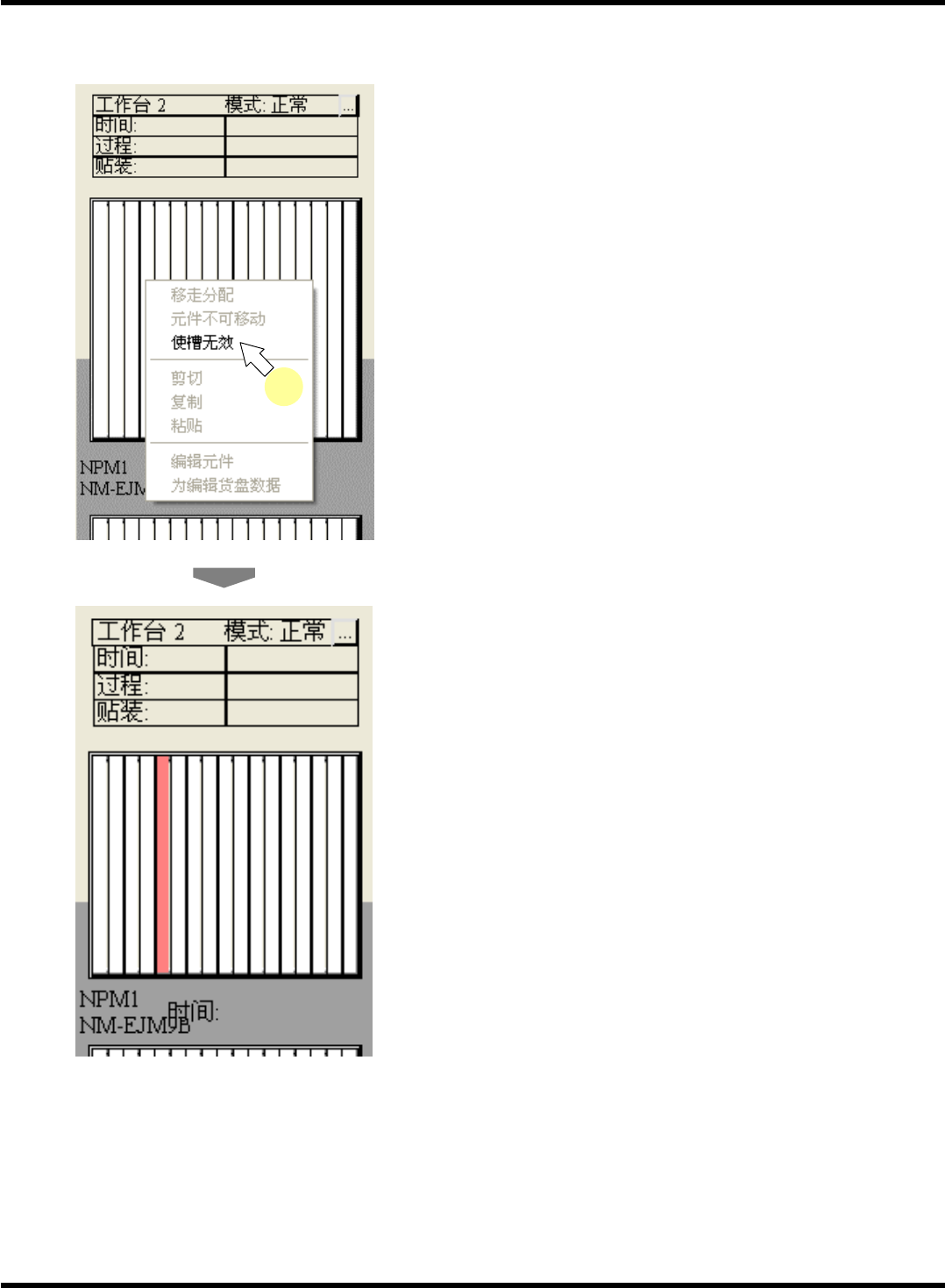 NPM-DGS 程序手册 7.3 送料器装配画面 Pa ge 7-10 EJS9AC- MB-07 P-02 设定禁止使用的插 槽 1. 右击进行禁止设定的插槽,选择 [ 使槽无 效 ] 。 • 所设定的插槽将会变成 分配禁止状态,以粉 红 色表示。 1
