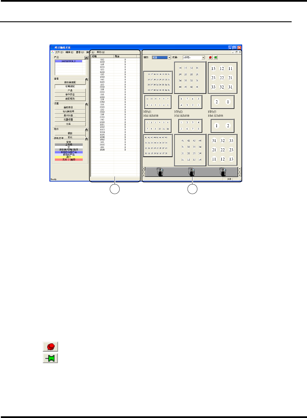 NPM-DGS 程序手册 7.4 吸嘴装配画面 Pa ge 7-12 EJS9AC- MB-07 P-02 7.4 吸嘴装配画面 通过吸嘴装配画面进行 吸嘴装配状态的确认 和更改。请在工作栏 的 ‘ 查看 ’ 中选择 [ 吸嘴装配 ] 。 ① 吸嘴一览 显示吸嘴一览和其剩余 数 ( 在仓库中所设定的数量 − 装配到吸嘴交换器的数 量 ) 。 ② 吸嘴装配 显示吸嘴装配。也可进 行吸嘴装配的更改。 ‘ 缩放 ’ 更改吸嘴装配的显示倍 …