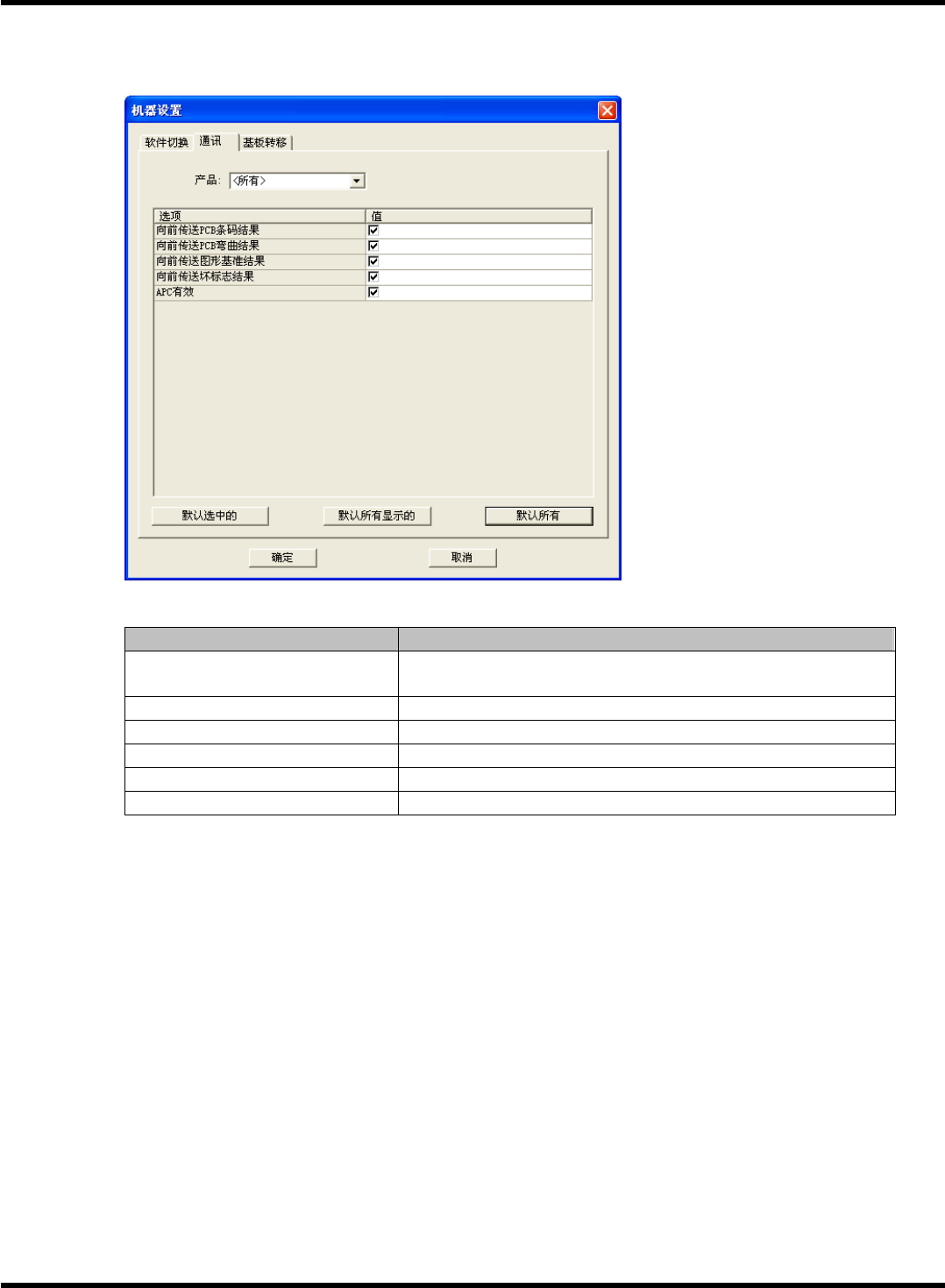 NPM-DGS 程序手册 7.8 各种设定 Pa ge 7-30 EJS9AC- MB-07 P-02 ② 通讯标签 设定是否将各机器之间 的共通信息从本机器 发送到下一个机器。 通讯设定项目 项目 说明 ‘ 产品 ’ 从组合框中选择要设定 的 PCB 。 目前显示在制作时选 择的 PCB 。 ∗ 对所有的 PCB 设定时,请选择 ‘< 所有 >’ 。 ‘ 向前传送 PCB 条码信息 ’ 设定基板条形码信息。 ‘ 向前传…
