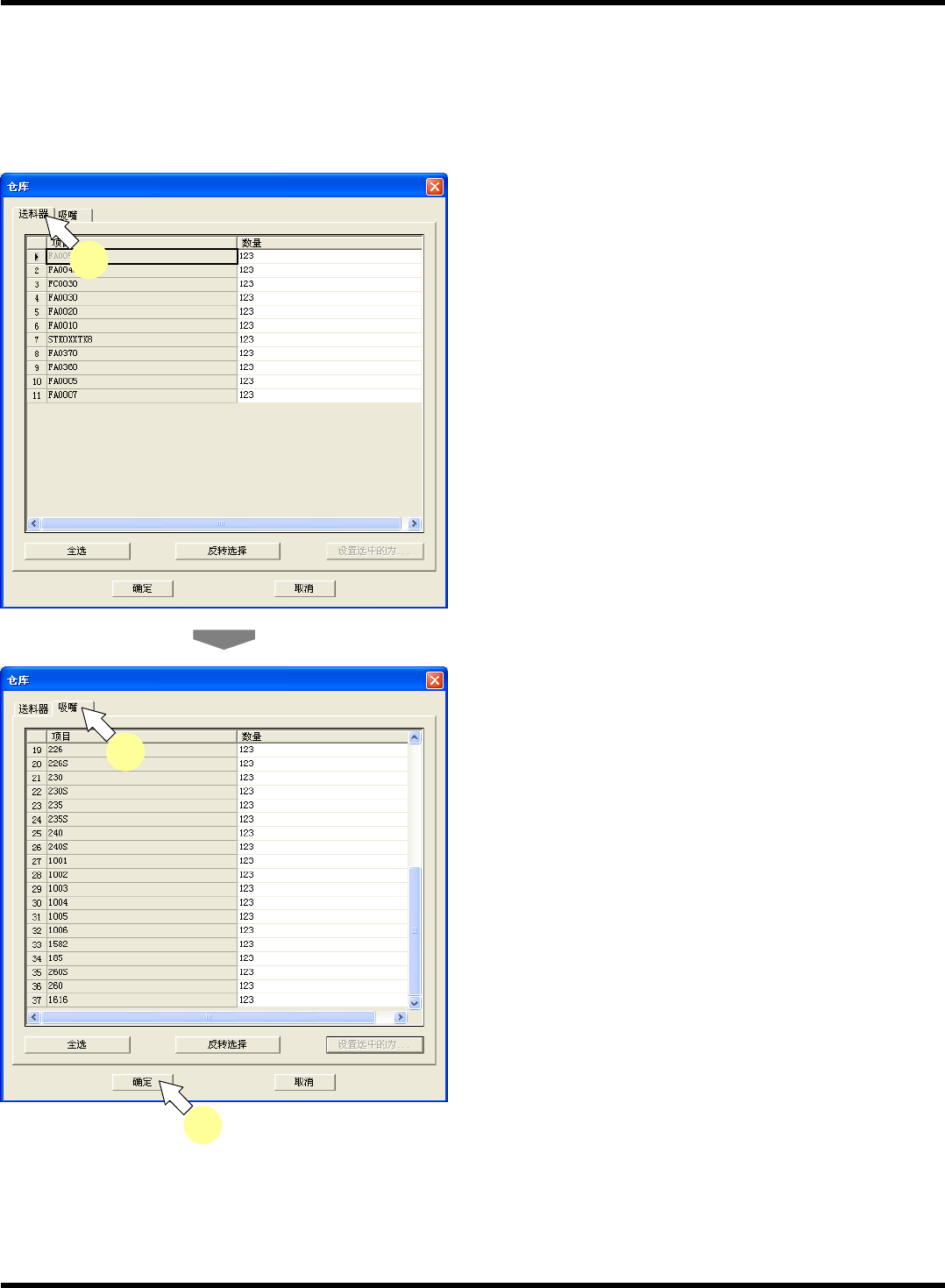NPM-DGS 程序手册 7.8 各种设定 Pa ge 7-32 EJS9AC- MB-07 P-02 7.8.5 仓库 ( 供料器、吸嘴的资源数 ) 的设定 通过 < 仓库 > 画面设定送料器 、吸嘴的资源数。更改 在工厂管理中设定的 资源数时使用。 仓库的设定 1. 在工作栏的 ‘ 设定 ’ 中选择 [ 仓库 ] 。 • 将会显示 < 仓库 > 画面。 2. 打开 [ 送料器 ] 标签,设定各送料器的资源…