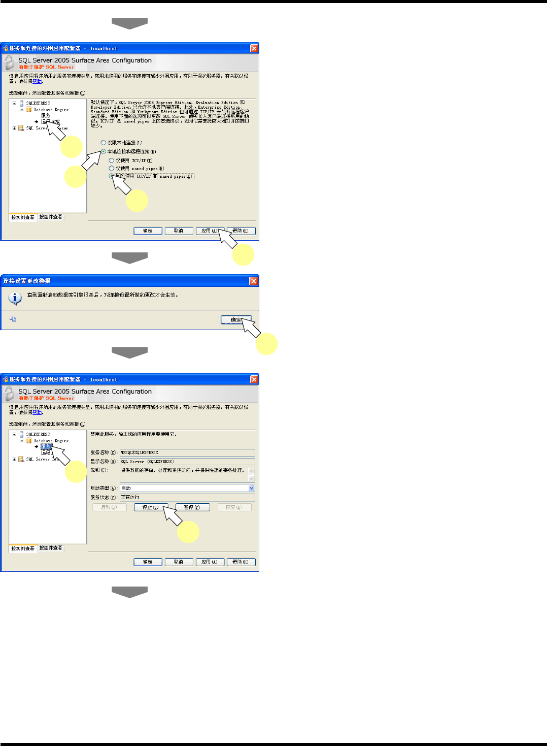 NPM-DGS 程序手册 1.1 安装 DGS 之前 Pa ge 1-22 EJS9AC- MB-01 P-02 6. 点击 [ 远程连接 ] 。 7. 按 ‘ 本地连接及远程连接 ’ → ‘ 使用 TCP/ IP 及带有名称的管道 ’ 的顺序将其变为有效。 8. 点击 [ 适用 ] 。 9. 点击 [OK] 。 10. 点击 [ 服务 ] 。 11. 点击 [ 停止 ] 。 6 7 8 7 9 10 11