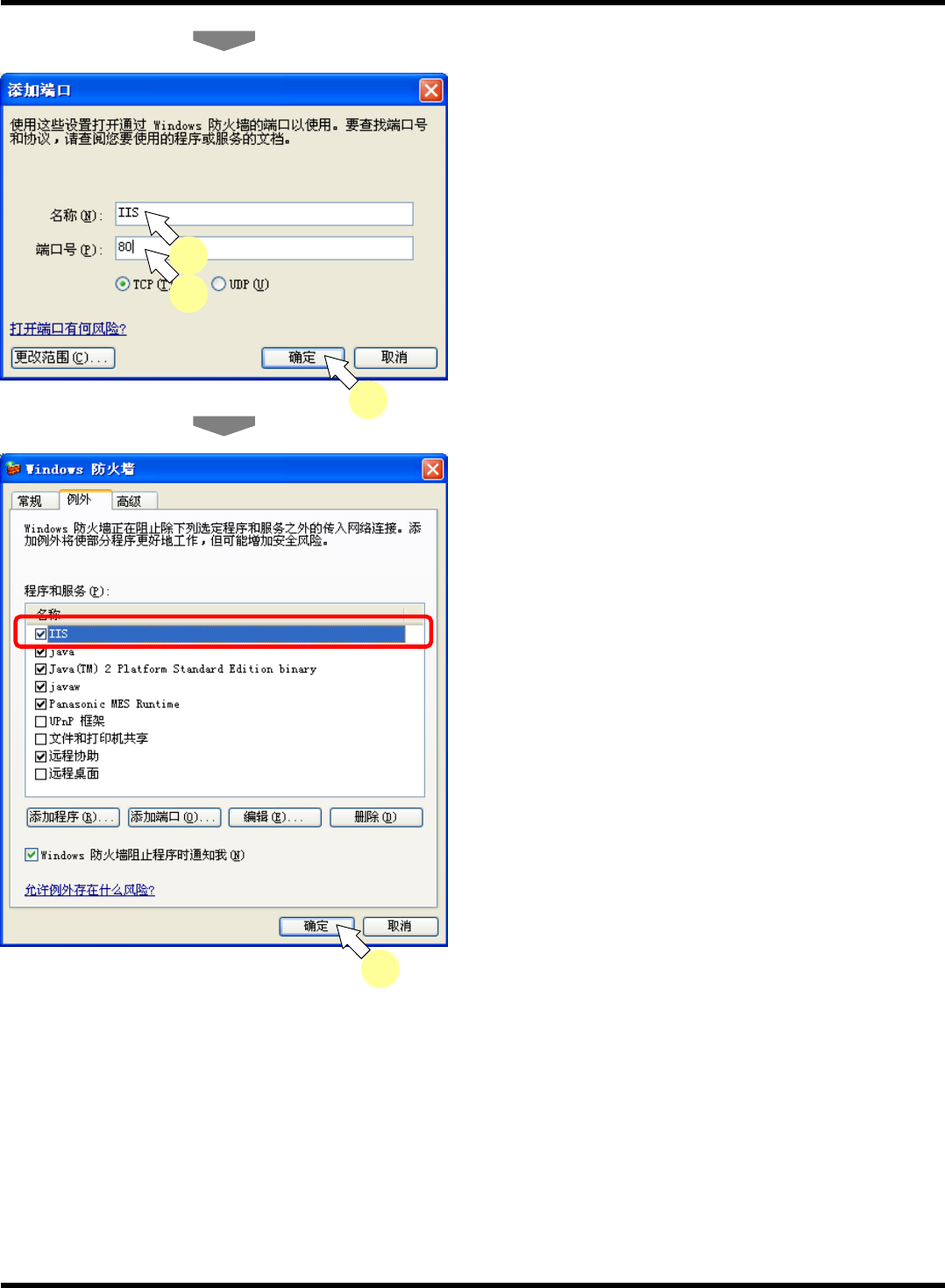 NPM-DGS 程序手册 1.3 网络的设定 Pa ge 1-40 EJS9AC- MB-01 P-02 5. 在 ‘ 名称 ’ 栏中输入 ‘IIS’ ,同时在 ‘ 端口号码 ’ 栏中输入 ‘80’ ,然后点击 [OK] 。 6. 点击 [OK] 。 • 已对 ‘ 程序及服务 ’ 栏中添加 ‘IIS ’ 。 5 5 5 6