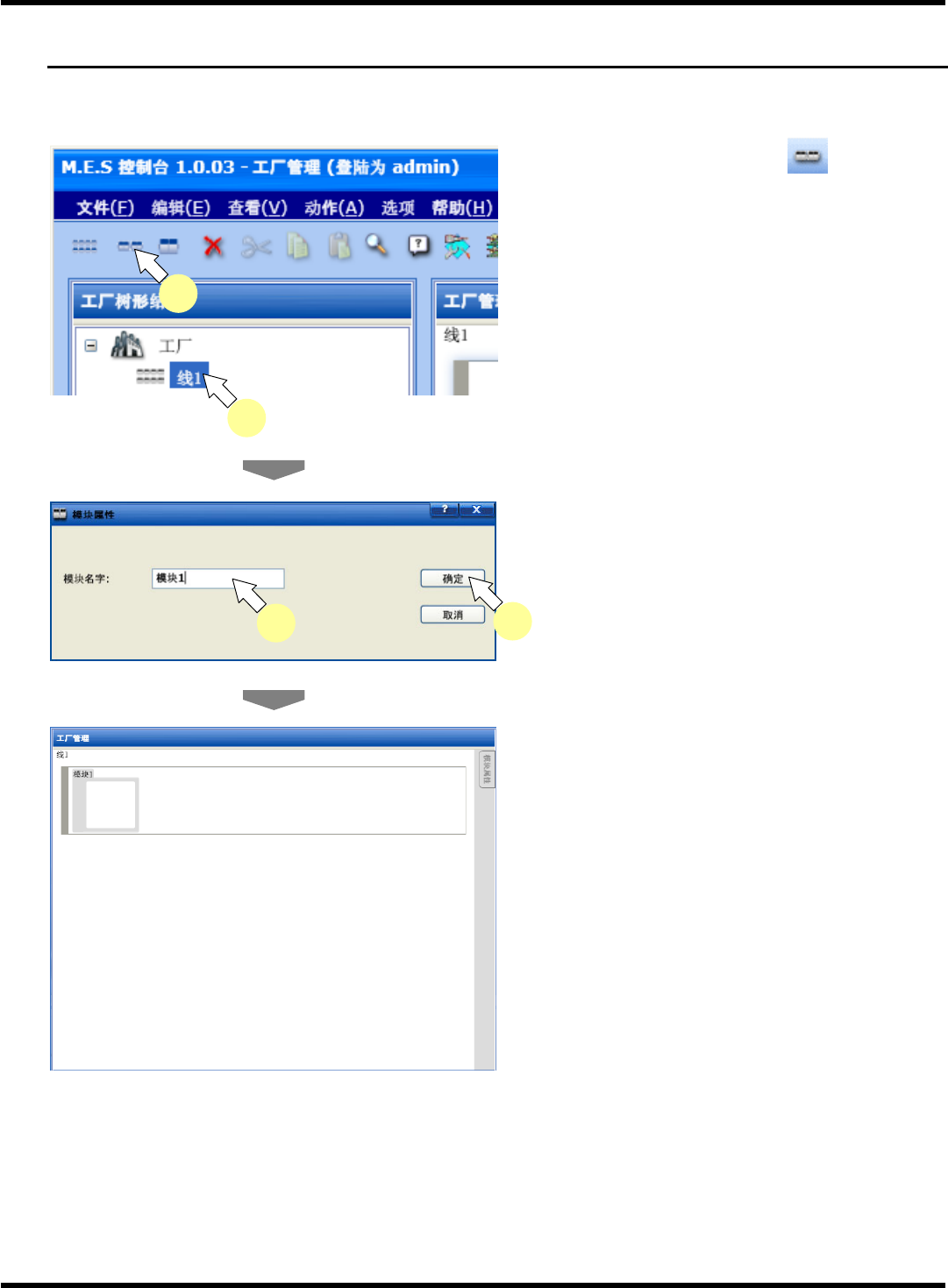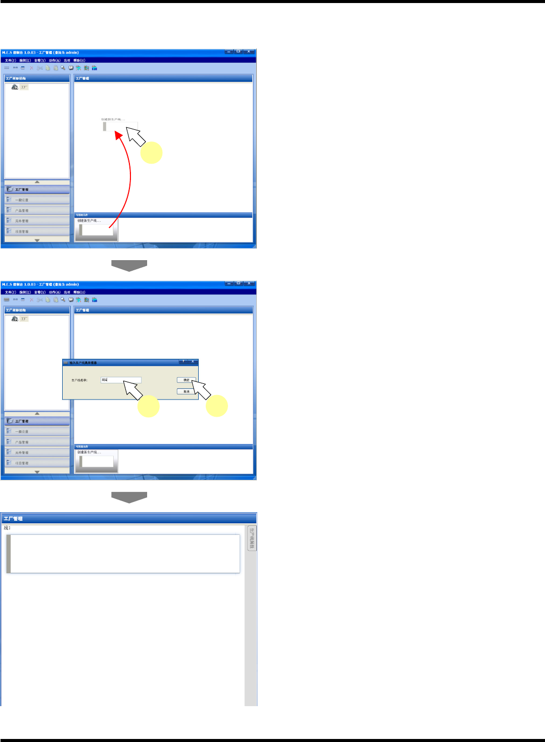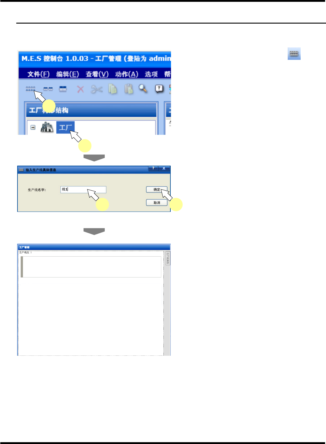 NPM-DGS 程序手册 4.2 工厂生产线的设置 Pa ge 4-4 EJS9AC- MB-04 P-02 添加生产线 ( 拖放 ) 1. 将生产线从工厂工具箱里拖拉到工厂内容 区域里。 • 将会显示 < 输入生产线具体 信息 > 画面。 2. 输入生产线名字。 • 最多可输入 20 个字符 ( 除以下特殊字符以外 ) ^ ~ | ; % & ? " 3. 单击 [ 确定 ] 。 • 在树状视图和工厂…
