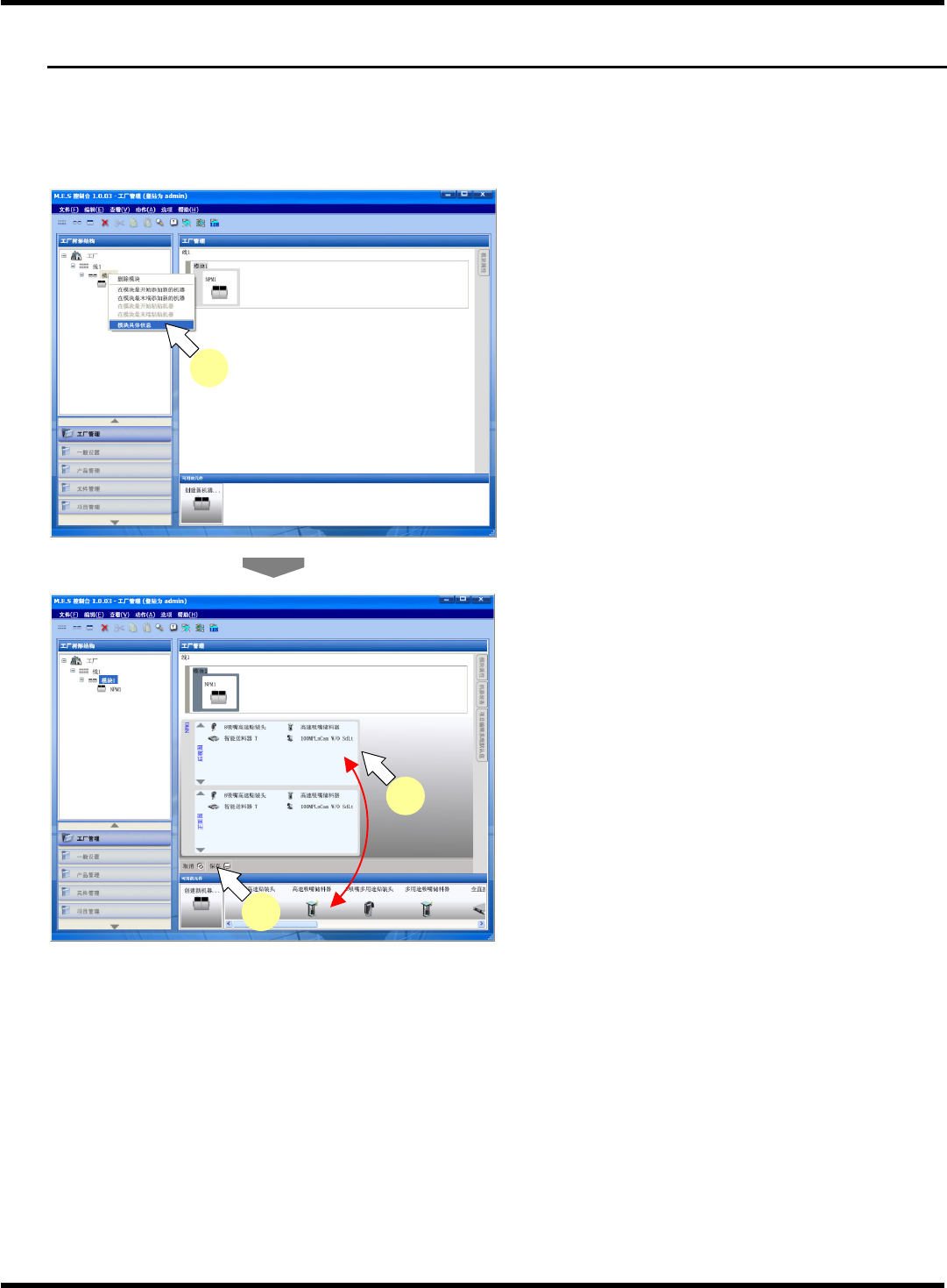 NPM-DGS 程序手册 4.5 设备选购件的设定 EJS9AC- MB-04 P-02 Page 4-9 4.5 设备选购件的设定 在信息显示区域中进行 设备所使用的选购件 的定义。 设备选购件设定的 确认、编辑 1. 在画面左上树形菜单的模块上右击,选择 [ 模块具体信息 ] 。 • 在画面中央部将会显示 已设定的选购件,在 画 面下部将会显示可设定 的选购件。 2. 通过拖放操作进行设备选购件的添加和删 除。 3. 单击 [ …