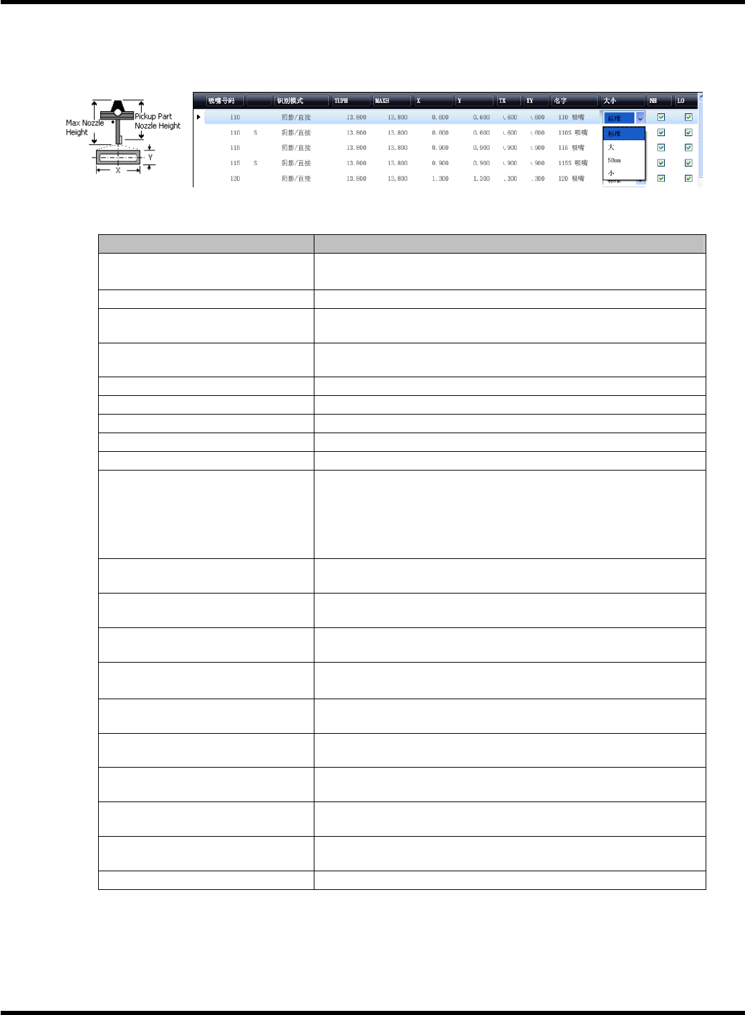 NPM-DGS 程序手册 4.8 吸嘴程序库编辑器 Pa ge 4-18 EJS9AC- MB-04 P-02 4.8.1 吸嘴数据 对吸嘴数据的详细内容 进行说明。 吸嘴数据设定项目 项目 说明 ‘ 吸嘴号码 ’ 吸嘴的编号。 不 能编辑标准吸嘴。 12 吸嘴用的小吸嘴时 , 吸嘴编 号的后面显示 ‘S’ 。 ‘ 识别模式 ’ 显示该吸嘴可对应的识 别模式。 关于多个显示, 机器会自动判断。 ‘TUPH’ 吸着高度 吸着元件时的吸…