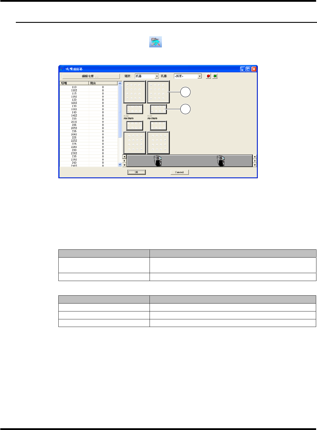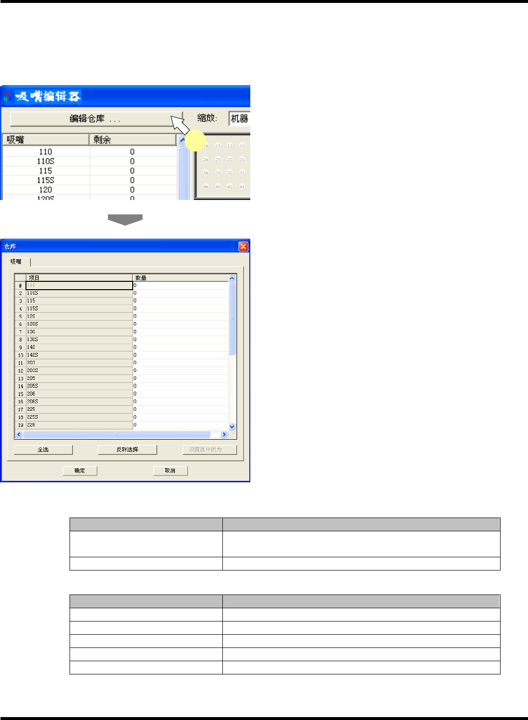 NPM-DGS 程序手册 4.9 吸嘴配置编辑器 Pa ge 4-20 EJS9AC- MB-04 P-02 4.9.1 吸嘴仓库 吸嘴总数的设定 从主画面左上的 [ 编辑仓库 ] 打开 < 仓库 > 画面,编辑各吸 嘴种类的总数。 1. 单击 [ 编辑仓库 ] 。 • 将会显示 < 仓库 > 画面。 2. 从 ‘ 项目 ’ 中选择吸嘴。 3. 在 ‘ 数量 ’ 中输入拥有的吸嘴数量。 显示项目 项目 说…