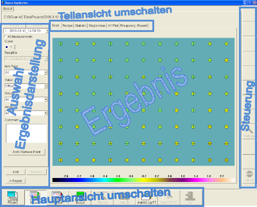 • Im Bereich »Hauptansicht« (unten) kann man zwischen Projektsteuerung, Ergebnisansicht,