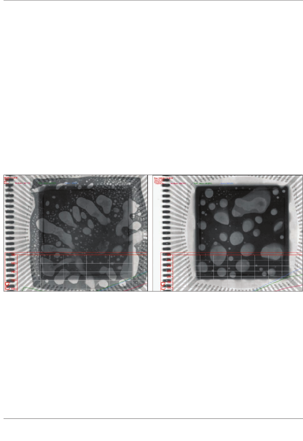 图 7-52 显示了 QFN 器件的两幅 X 射线图像,呈现了不同温度下空洞形成和动态。图像的下方是温度曲线的追