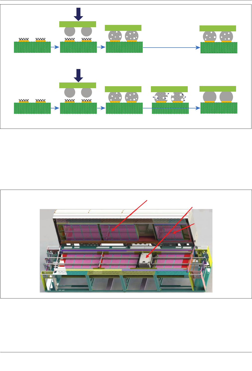IPC-7095D-W AM1 CN 2019 年 1 月 133 图 7-67 采用标准再流焊接(上)和真空辅助再流焊接(下) BGA 焊点的比较 A– 焊膏印刷 D– 焊料熔融时施加真空 B– 元器件贴片 E– 冷却后焊点形成 C– 再流焊接 已制造有利用真空辅助焊接的再流焊炉。在线再流焊炉紧接着再流区之后和冷却区之前有一个真空区。 图 7-68 显示了这样的炉子设计。由于增加了真空区,再流工艺的循环时间也会延长,但该时间延长小于 …