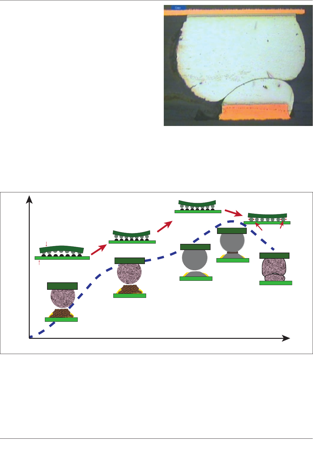 开始塌陷,焊球再次与熔融焊膏块接触。如果焊球和熔融焊膏块熔合在一起,会形成一个理想的焊点(见图