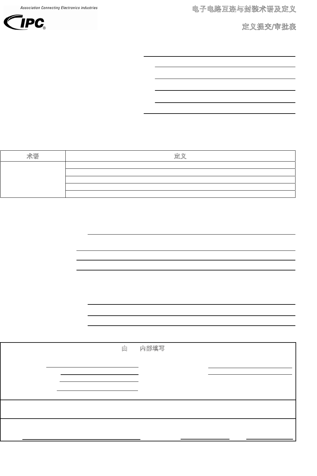 此页留作空白 ANSI/IPC-T-50 电子电路互连与封装术语及定义 定义提交/审批表 此表是为了及时收录行业中广泛使用 的术语和定义,以修订本标准。 欢迎个人或单位参与发表意见。 请填写此表并反馈给 : IPC 3000 Lak eside Drive, Suite 105N Bannockburn, IL 60015-12 49 传真 : 847 615.7105 申请人信息 : 姓名 : 公司名称 : 所在城市 : 所属国家 :…