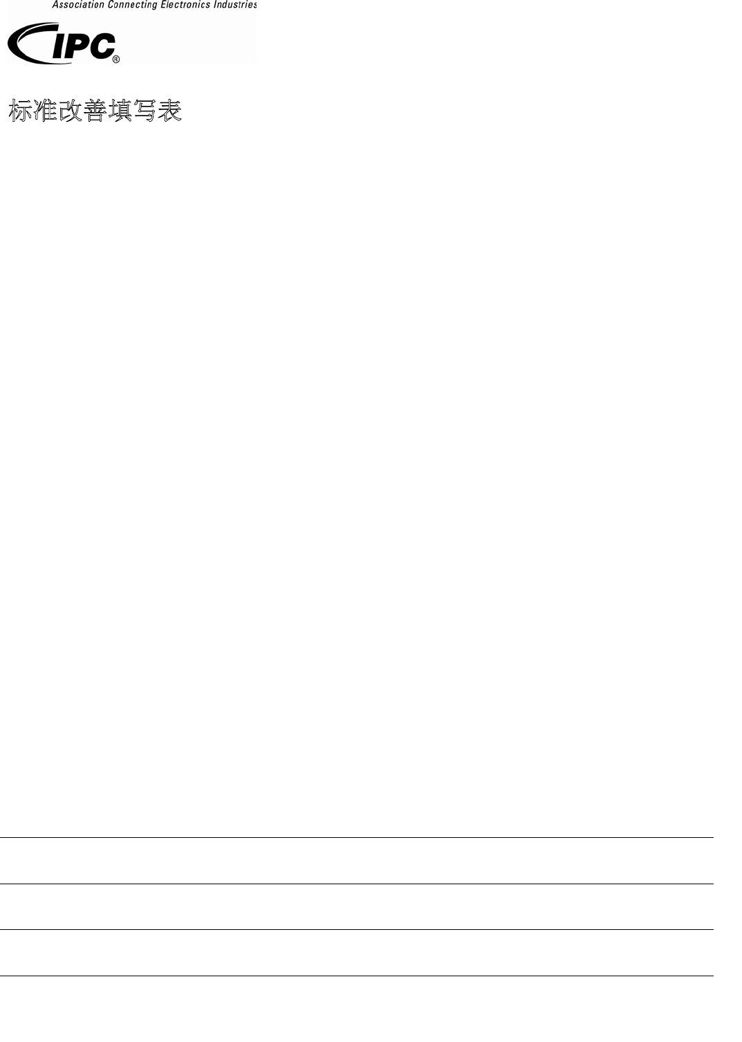 ANSI/IPC-T-50 电子电路互连与封装术语及定义 定义提交/审批表 此表是为了及时收录行业中广泛使用 的术语和定义,以修订本标准。 欢迎个人或单位参与发表意见。 请填写此表并反馈给 : IPC 3000 Lak eside Drive, Suite 105N Bannockburn, IL 60015-12 49 传真 : 847 615.7105 申请人信息 : 姓名 : 公司名称 : 所在城市 : 所属国家 : 电话号码 :…