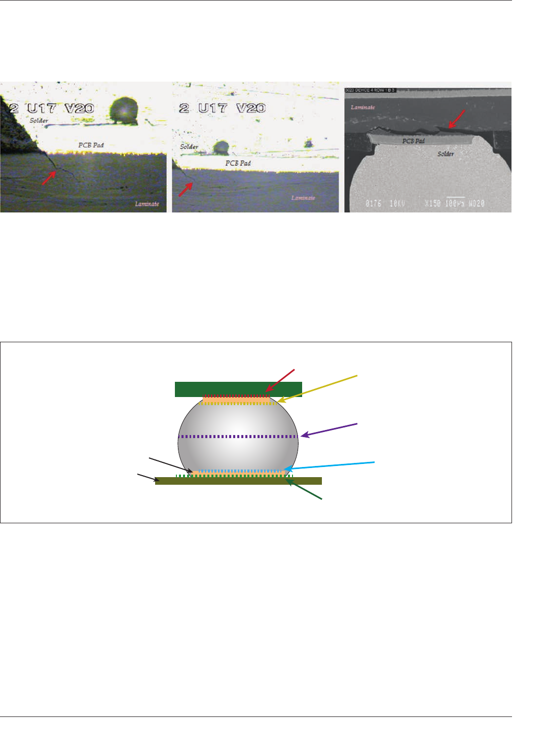 BGA 焊点有若干可能的失效模式。图 3-8 强调了焊盘坑裂位置与其它形式焊点失效位置之间的关系。焊盘坑