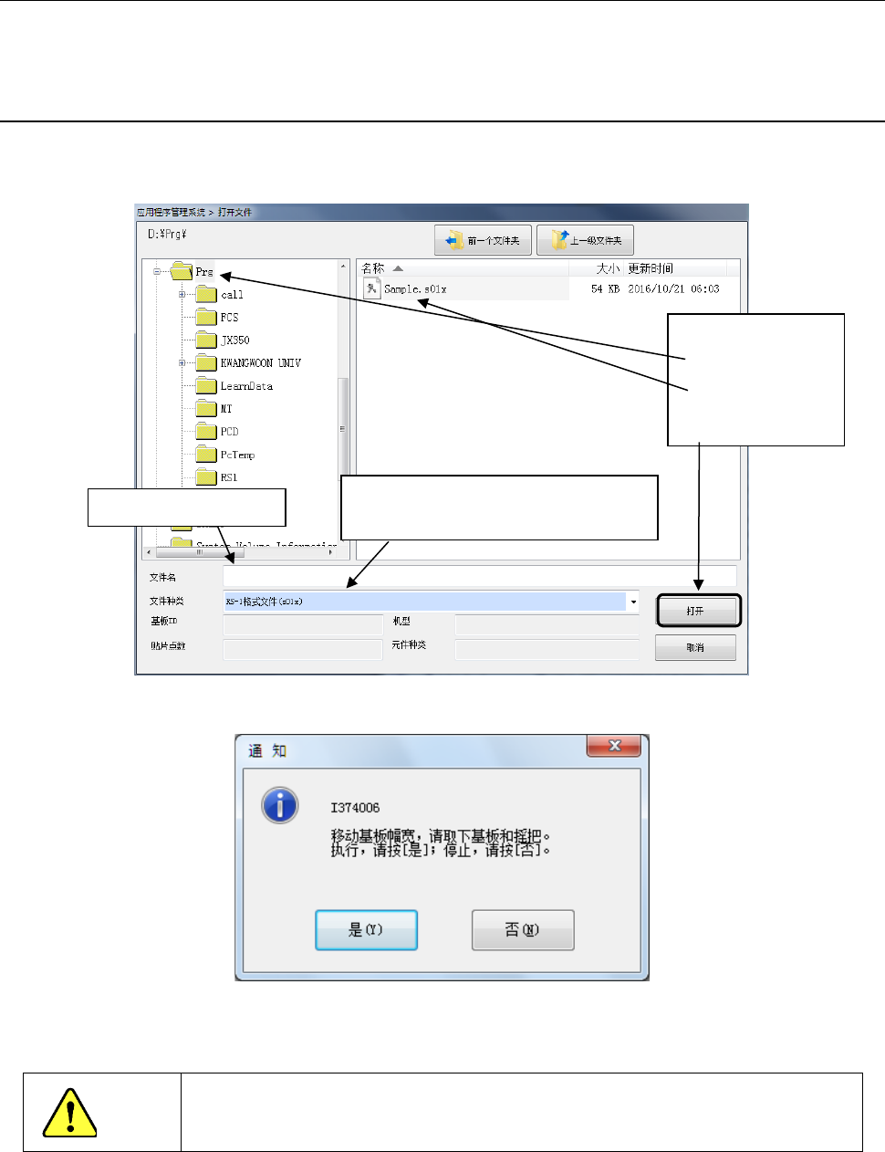 第 1 部 基本篇 第 2 章 生产 2- 20 2- 6 文件操作 进行生产时,需 打开生产程序文 件。 此外,在「生产 」 画面 中改变数据时,或 为保存生产管理 信息,也可保 存变更的数据。 2-6- 1 打开(读入文件) 读入已经制作好 的生产程序文件 。 从菜单点击 [ 文件 ]-[ 打开 ] ,则显 示如下画面。 选择文件,点击 [ 打开 ] ,即 可读入选择的文件。 接着显示下列 提示信息 。 选择 [ 是 ] ,即可显示…