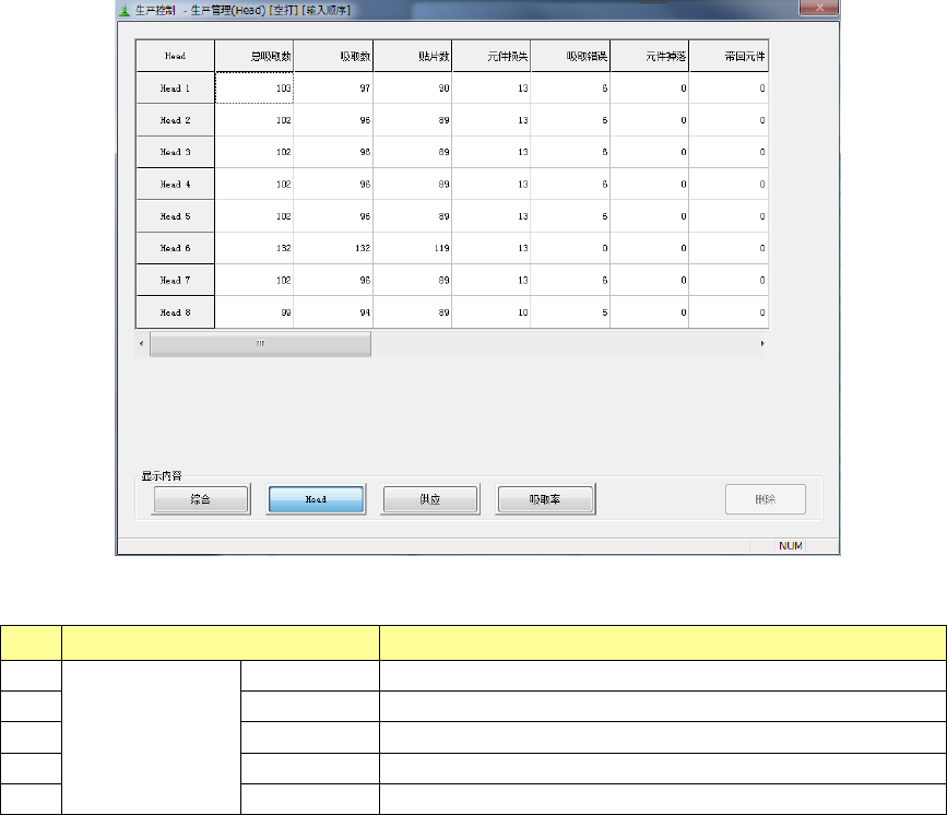 第 1 部 基本篇 第 2 章 生产 2- 57 No 项目 内容 1 He ad 显示 相应 Hea d 的号码。 2 总吸取 数 使用 相应 Hea d 吸取动作的次数 。 (吸取数 + 吸取错误) 3 吸取数 该 Head 吸取成功的元 件数。 4 贴片数 该 Head 吸取贴片 的元件数。 5 元件损失 该 He ad 损失的元 件数。 (吸取总次数- 贴片数) 6 吸取错误 该 H ead 吸取失败的次数。 7 元件掉落 显示…
