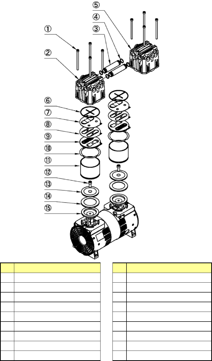 第 1 部 基本篇 第 3 章 维护 3- 38 真空泵分解图 No. 名称 No. 名称 1 内六角螺栓( M6×95 ) 8 根 10 气缸密封圈 2 泵 头盖 1 11 气缸 3 连接管 12 内六角螺栓( M8×20 ) 4 O环 P-10 13 碗型密封圈压板 5 泵 头盖 2 14 碗型密封圈 6 密封圈 15 连杆 7 阀挡板 8 吸排气阀 9 气缸板