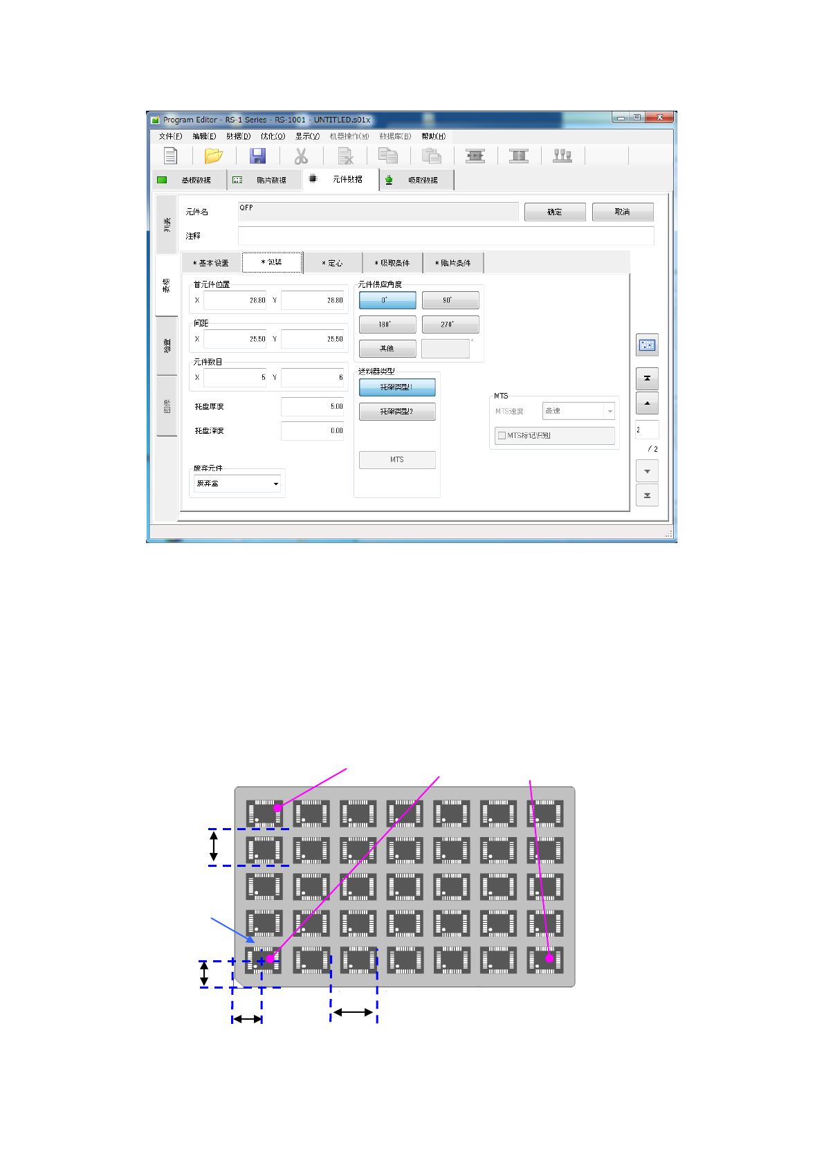 托盘元件的首元件中心位置尺寸(XY) : 输入托盘外形起的尺寸。