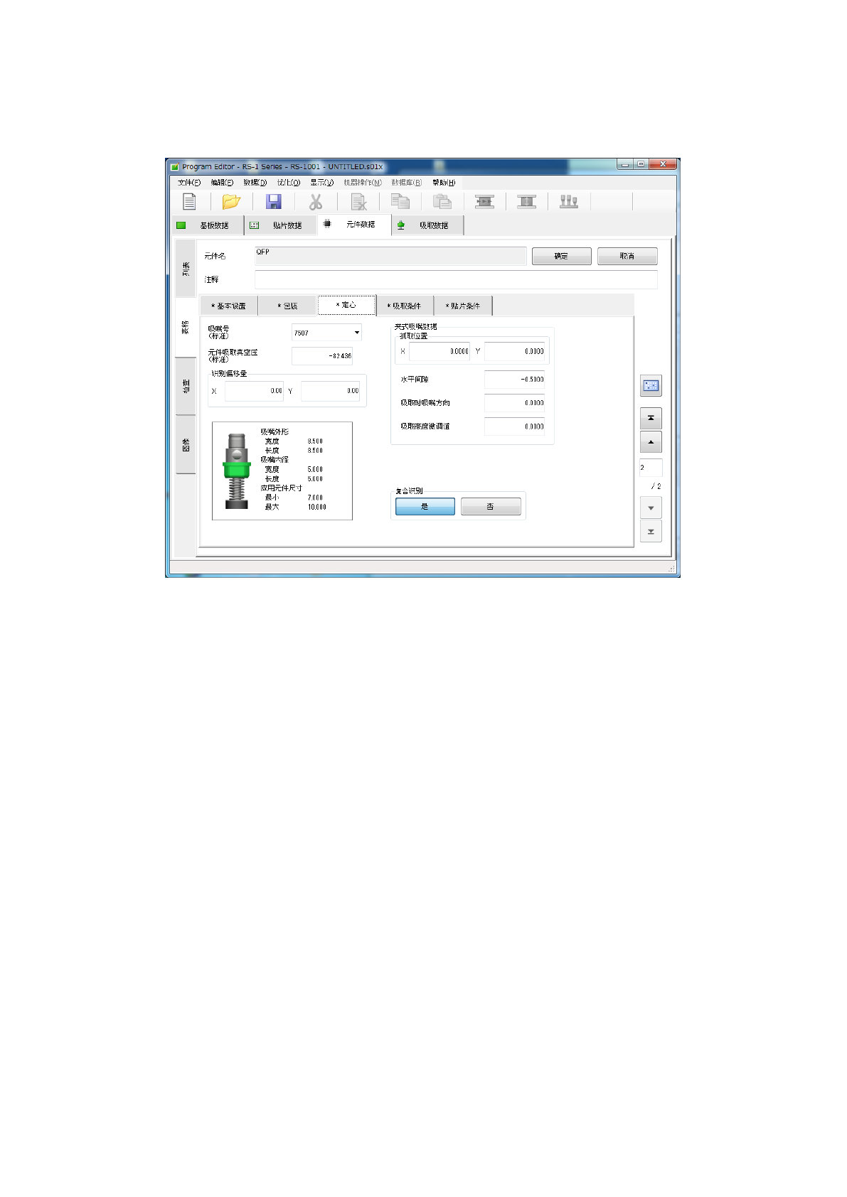 第 1 部 基本篇 第 4 章 制作生产程序 4- 64 2) 图像定心时 选择定心选项卡 ,即显示如下画 面。 ① 吸嘴号 ② 元件吸取真空 压 与 「( 1 )激光定 心时」的设置相 同。