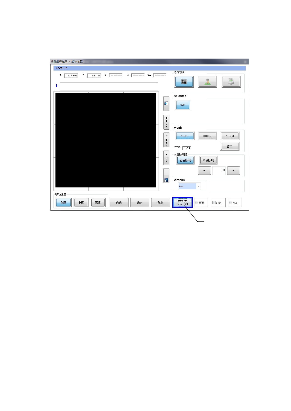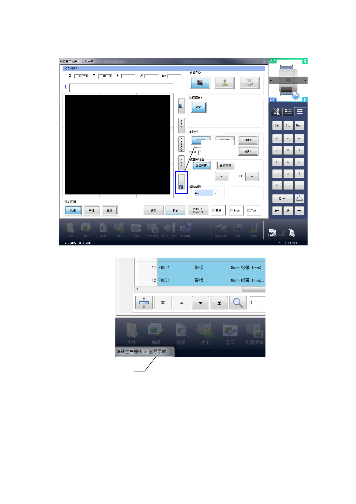 栏的[示教]。但必须预先在编辑程序中输入标记的 XY 坐标。