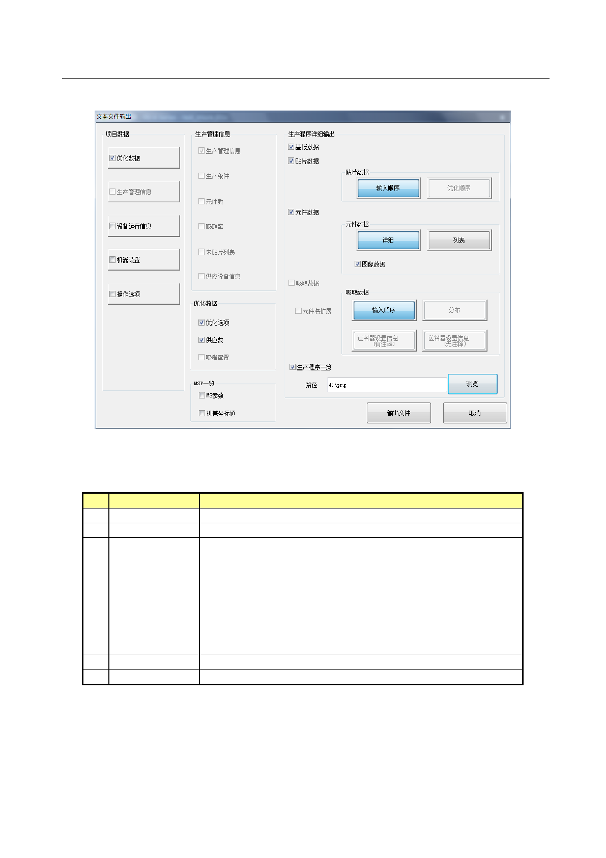 第 1 部 基本篇 第 4 章 制作生产程序 4- 280 (2) 生产管理信息 选择生产管理 信息的 相关输出数据。 No. 项目 内容 1 生产管理信 息 输出生产时的管理信 息。 2 生产 条件 输出生产条 件。 3 元件数 输出元件 数。 4 吸取率 输出各 吸取率 。 5 未贴片列表 输出未贴片列表。 6 供应设备信 息 输出供应设备的信息 。 (3) 优化数据 选择优化的 相关输出数据。 No. 项目 内容 1 优化选项 输…