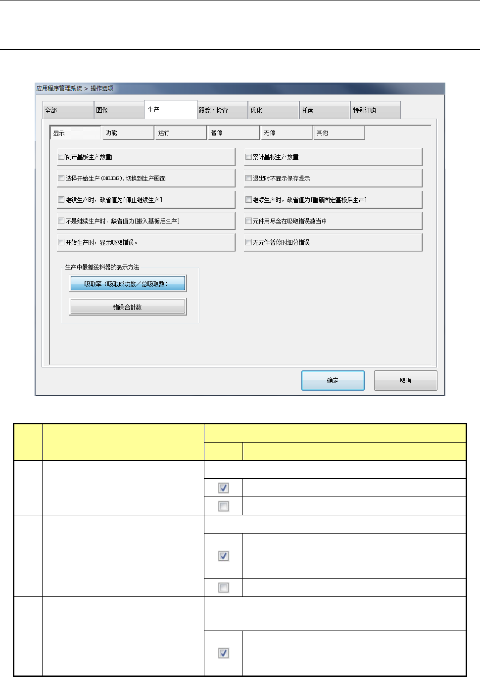 第 2 部 功能详解篇 第 7 章 操作选项 7-8 7- 4 生产 设置生产时处理 的操作选项。 7-4- 1 显示 按下 [ 显示 ] 按钮后,画面 上会显示 “ 生产时显示的 选项设置画面 ” 。 序 号 项目 内容 状态 动作及详细内容 1 倒计基板生产数 量 对基板生产数量 的显示方法 进行设置。 显示剩余的预计 生产数量。 显示实际生产数 量。 2 累计基板生产数 量 对生产基板数量 的更新方法进行 设置。 不清除生产管理信…