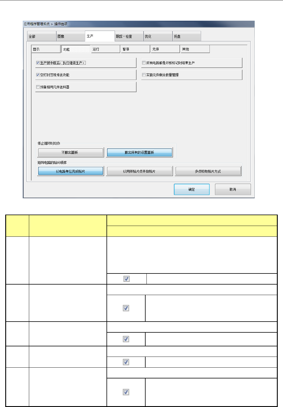 第 2 部 功能详解篇 第 7 章 操作选项 7- 12 序号 项目 内容 动作及详细内容 6 停止循环时动作 对循环动作停止 时是否搬出基板 进行设置。 不搬出基板 生产中,按下单循环 键 时,生产一块基板结束后 不搬出 基板,而是留在 工作台上。 ・ 解除夹紧基板 ,暂停。 ・ 按下 <START> 开关后,重新开始生 产。 搬出所有的设 置基板 将贴片中的基板 排出到后工序后 ,结束生产。 7 矩阵电路的贴片 顺序 指…