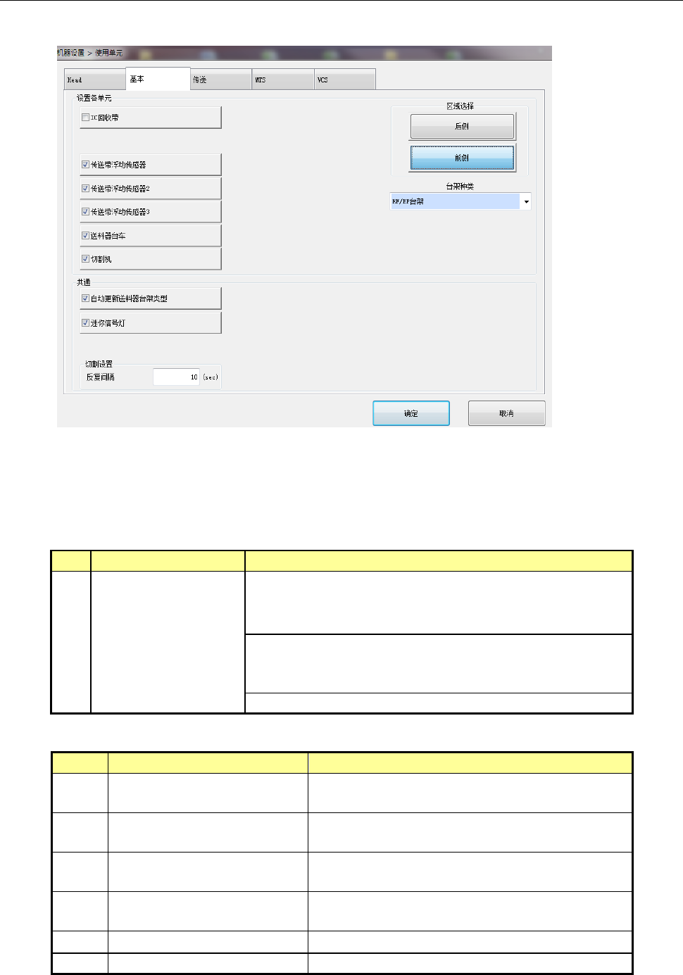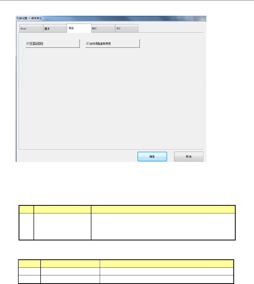 第 2 部 功能详解篇 第 8 章 机器设置 8-8 8-3-1- 2 基本 选择 基本,会显示 以下画面。 点击各选项卡, 可指定 [ Head ] 、 [ 基本 ] 、 [ 传送 ] 、 [MTS] 、 [VCS] 。 (1) 设置项目 No. 项目 设置内容 1 基本 指定单元的 使用/不使用。 万一单元发生故 障时, 若本项目里设置为 “ 不使用单元 ” , 可在不变更生产 程序数据的情况 下执行吸取贴 片。 显示各个台架的 台…