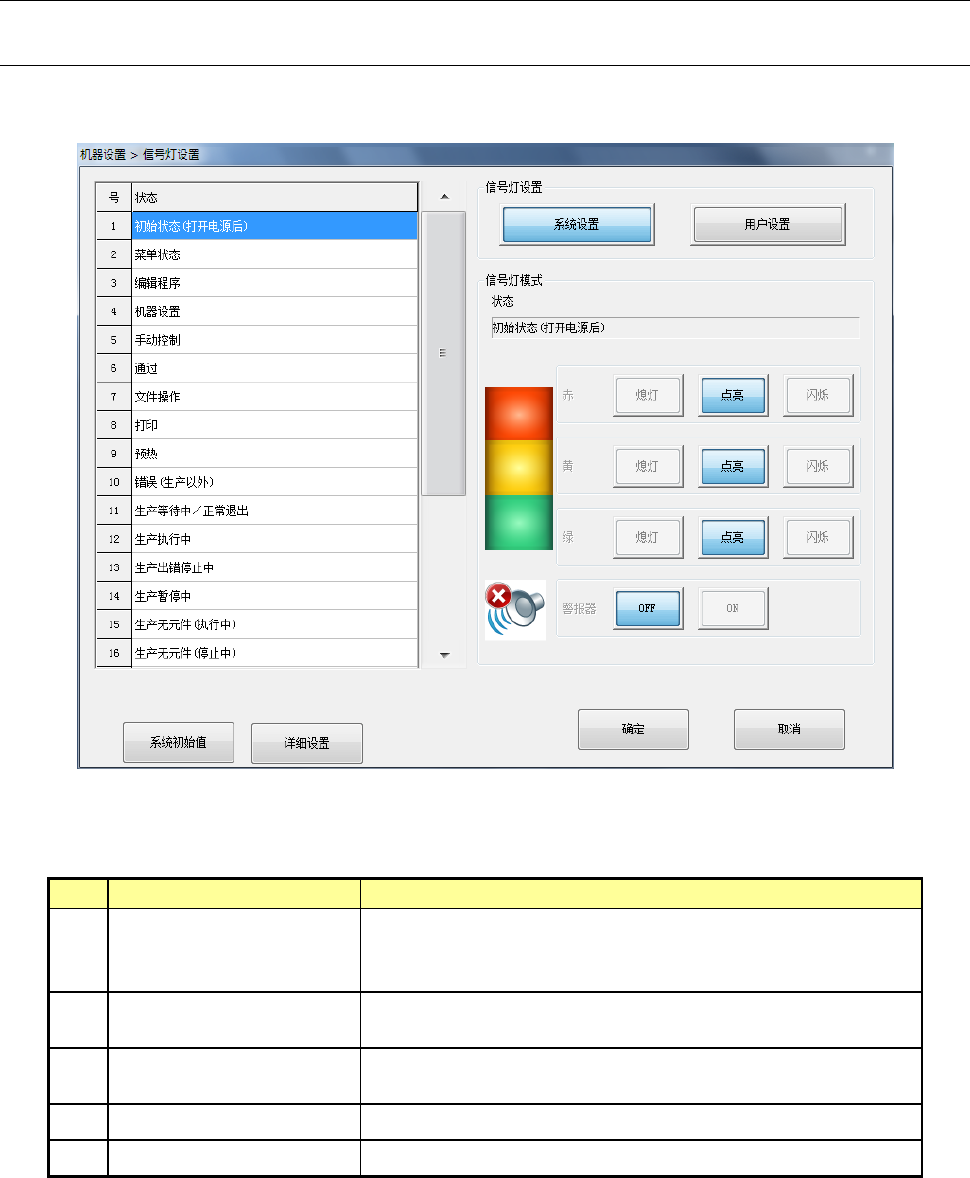 第 2 部 功能详解篇 第 8 章 机器设置 8- 40 (2) 初始值 No. 状 态 信号灯模式 备 注 点亮状况 红 黄 绿 警报器 1 初始状态 ( 打开电源后 ) 全部点亮 OFF 2 菜单状态 黄灯点亮 ― ― OFF 3 编辑程序 黄灯点亮 ― ― OFF 4 机器设置 黄灯点亮 ― ― OFF 5 手动控制 黄灯点亮 ― ― OFF 6 通过 黄灯点亮 ― ― OFF 7 文件操作 黄灯点亮 ― ― OFF 8 打印 黄…