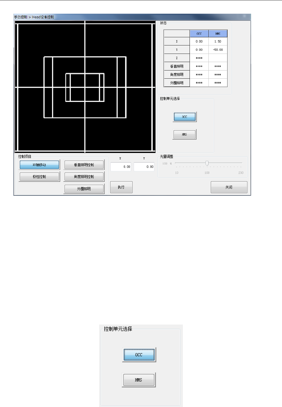 OCC 外圈照明的 ON/OFF,进行控制。与(b) 垂直照明控制一样要设定光量