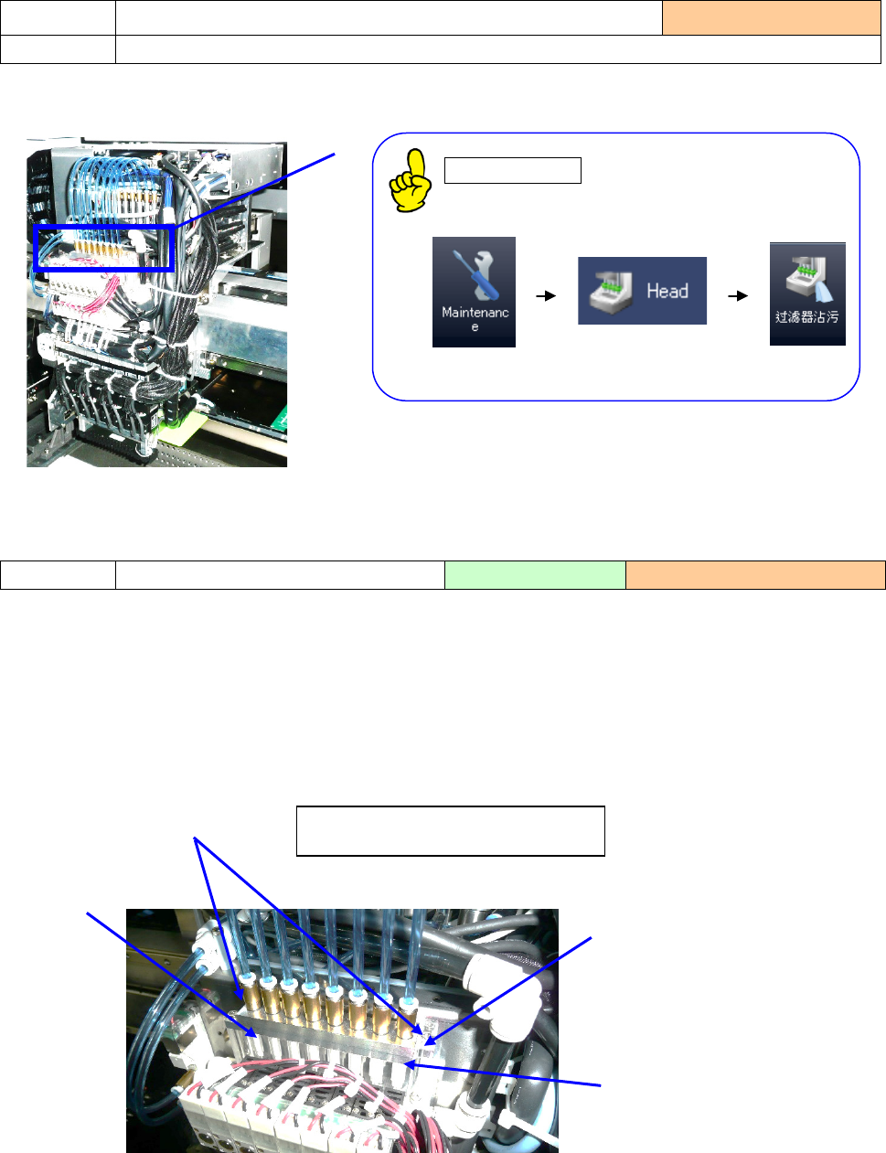 第 1 部 基本篇 第 3 章 维护 3-6 1) 请目检确认 Head 单元正面 部位过滤 器箱内的「空气过 滤器① 」没有脏污。 2 )请通过 「过滤器脏污检查」 确认没有问题 。 检查过滤器脏污 「使用 说明书 11 -3-3-2 检查过滤器脏污 」 执行结果若有问 题,会显示提示 ,敦促更换。 3) 如果有脏污, 请更换新 的过滤器。 1) 把过滤器箱的「 固定螺丝② 」( 左右 2 处) 拧松,取下 「 过滤 器箱 U① 」 …