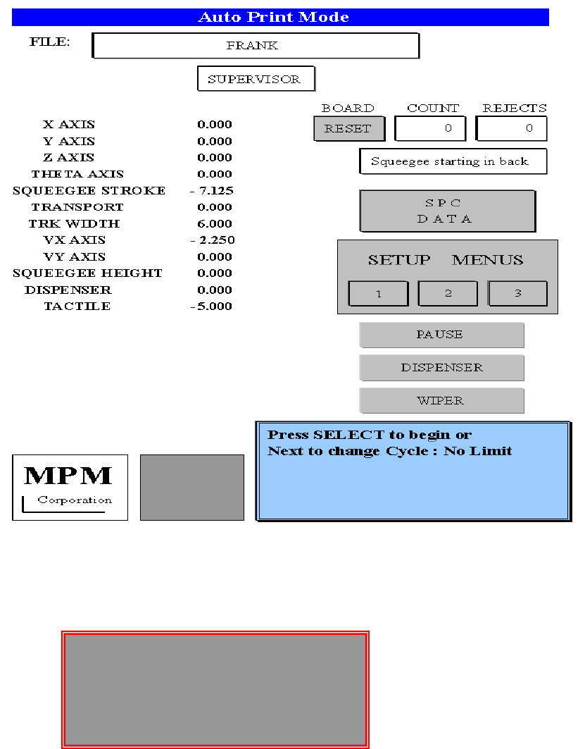 11 暫時停止印刷按鈕 啟動加錫膏按鈕 ※ ( 必須在設定第 2 頁 Enable Buttons 內將 Dispense 打開為 Y es) Press SELECT to raise squeegee ( 按 SELECT 後刷刀會上昇,以便產生 to allow move room when adding paste, 足夠空間 , 讓操作員加錫 ) or Press NEXT to continue ( 按 NEXT 後在原地 …