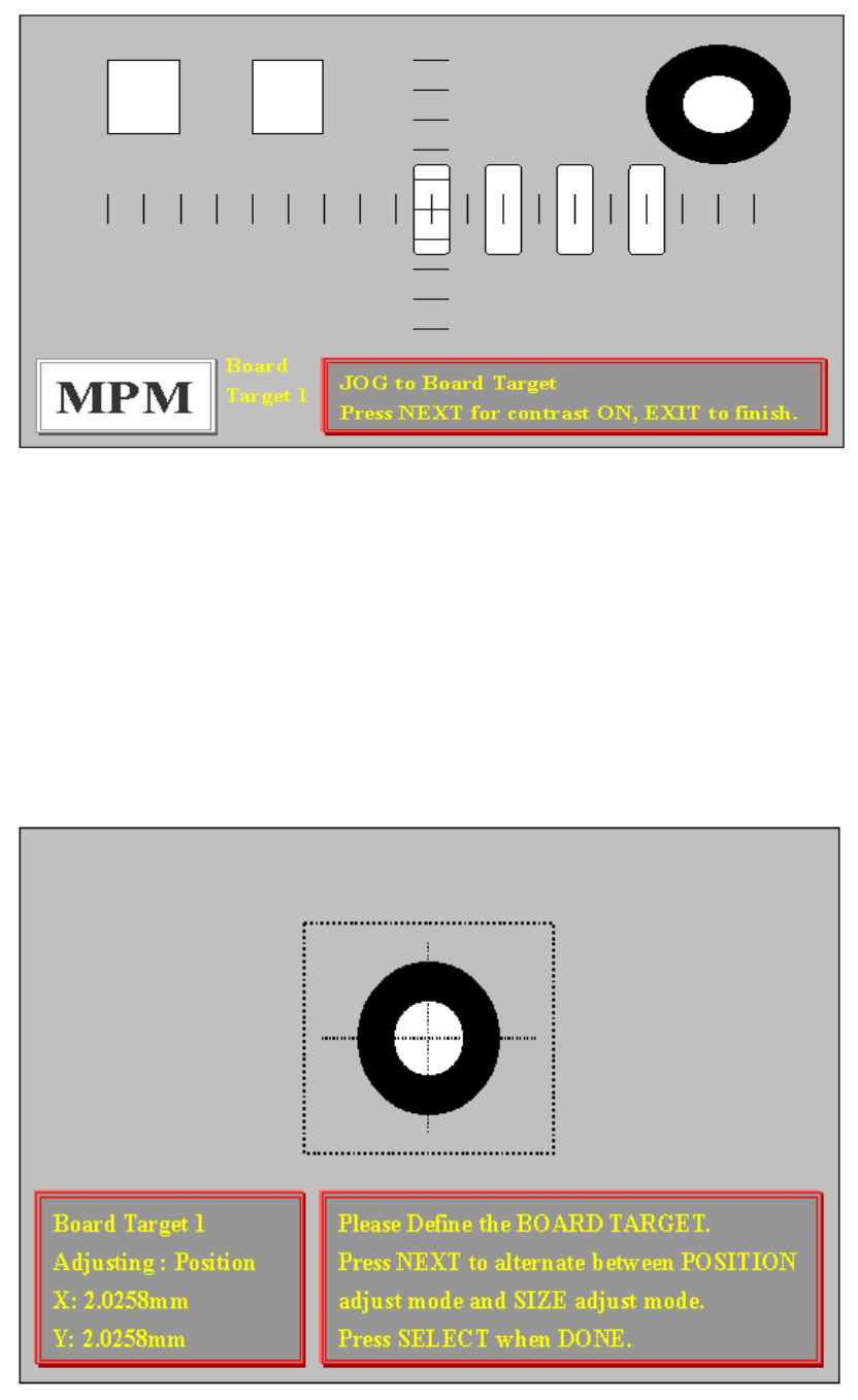 40 Pr ess DONE when finished. ( 按 DONE 完成 ) 按 NEXT 之後,出現下列視窗: Move the trackball pointer to the ar ea ( 移動軌跡球指到 PC 板上 Mark 點位置後 , where a t arget is to be Added and 按 SELECT 後,影像視覺系統會移動到你 the pr ess SELECT . 所指的位置 ) 按 SE…