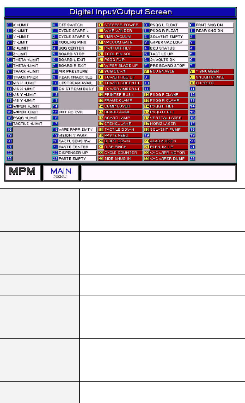 88 TRACK PROX 軌道寬度與真空隔板防撞感應器 VIS X +LIMIT 影像視覺系統 X 軸正向的極限感應器 VIS X -LIMIT 影像視覺系統 X 軸負向的極限感應器 VIS Y +LIMIT 影像視覺系統 Y 軸正向的極限感應器 VIS Y -LIMIT 影像視覺系統 Y 軸負向的極限感應器 WIPER +LIMIT 鋼板擦拭裝置正向的極限感應器 WIPER -LIMIT 鋼板擦拭裝置負向的極限感應器 PSQG +L…
