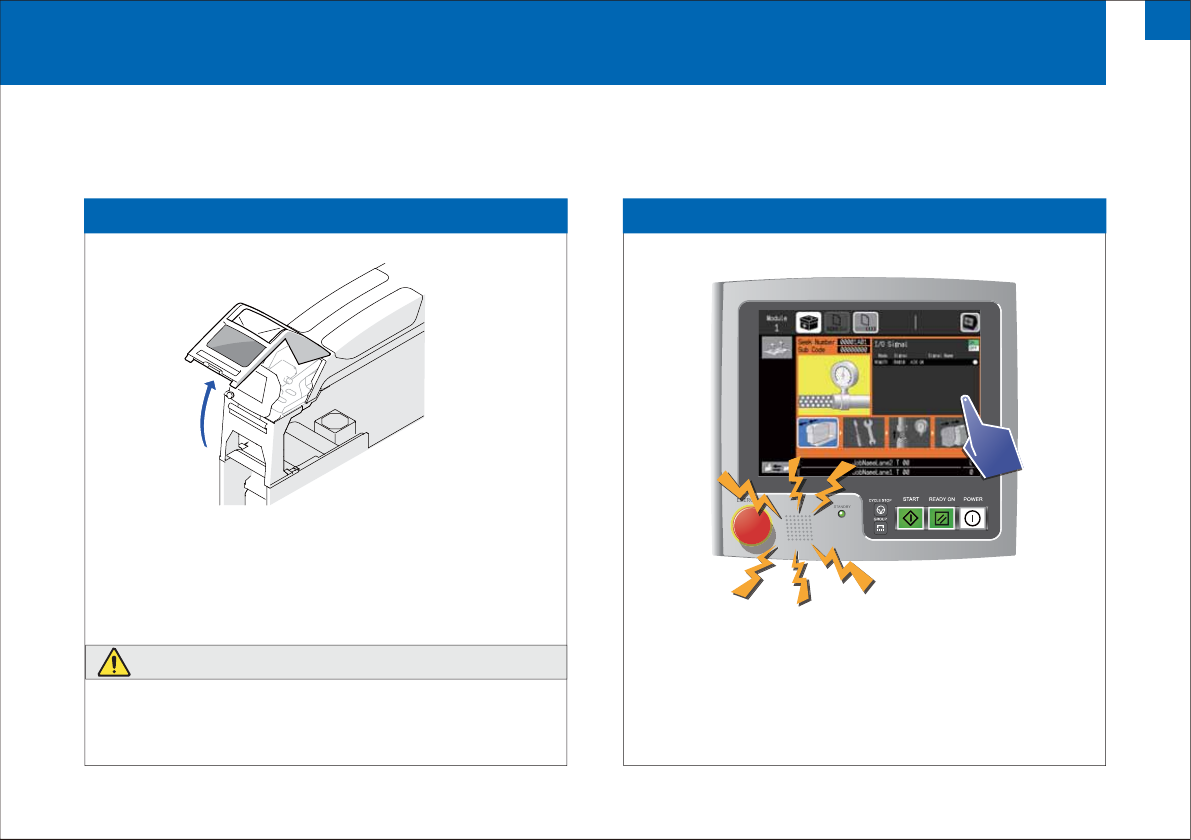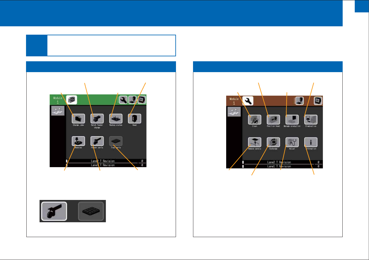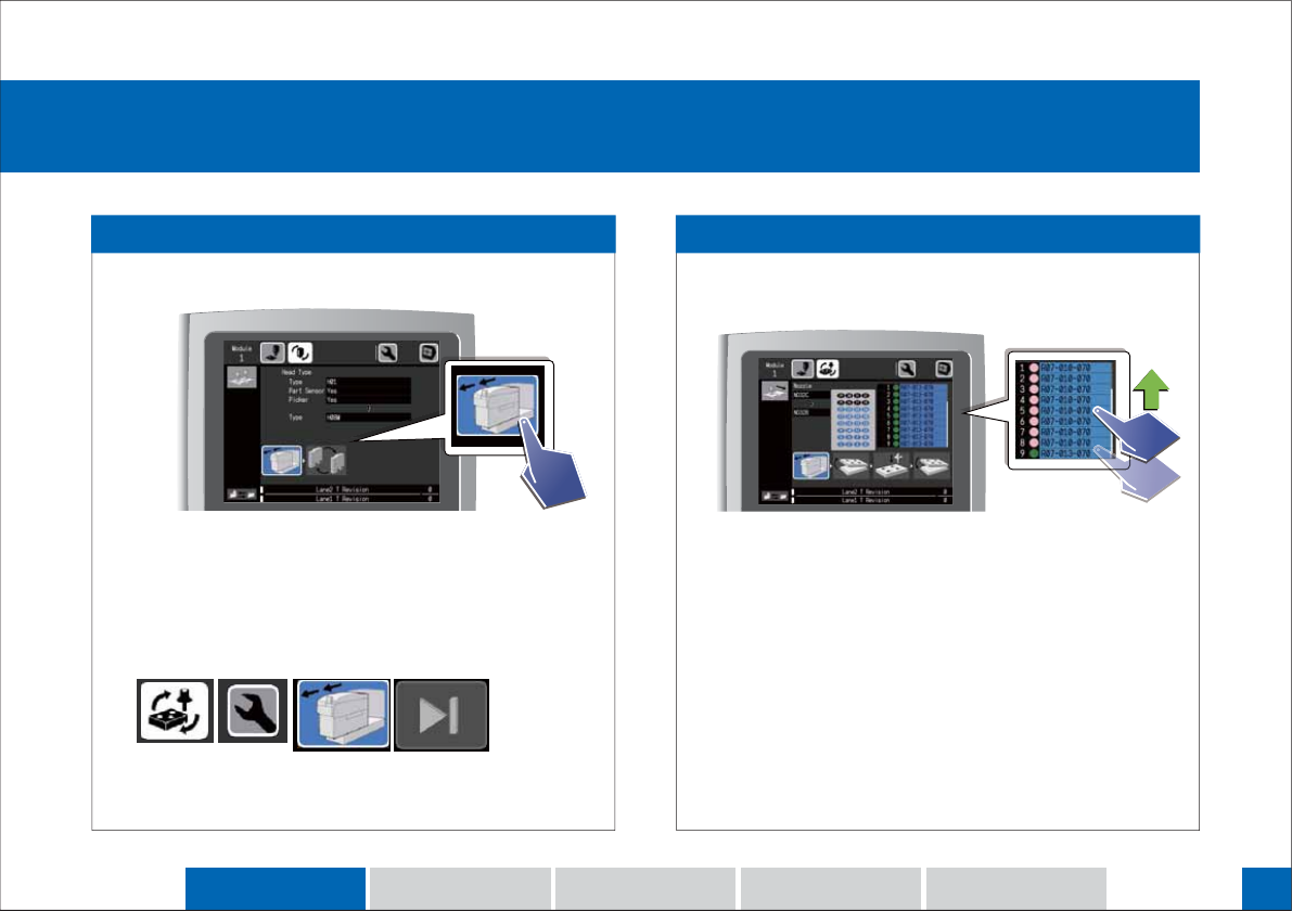 机器概要 生产准备 生 产 换 线 示意图 7 滚动一览表时 按下按钮时 选择中 (背景:白色) (背景:灰色) 可以选择 (背景:蓝色) 可以选择 作业向导中 (背景:深灰色) 不可选择 白色框线内的象形图为按钮。 请点击框线内部分。 显示滚动条时,可以滚动一览表。 请使用手指上下移动。 机器概要 机器概要 5. 5. 触摸屏的基本操作 触摸屏的基本操作