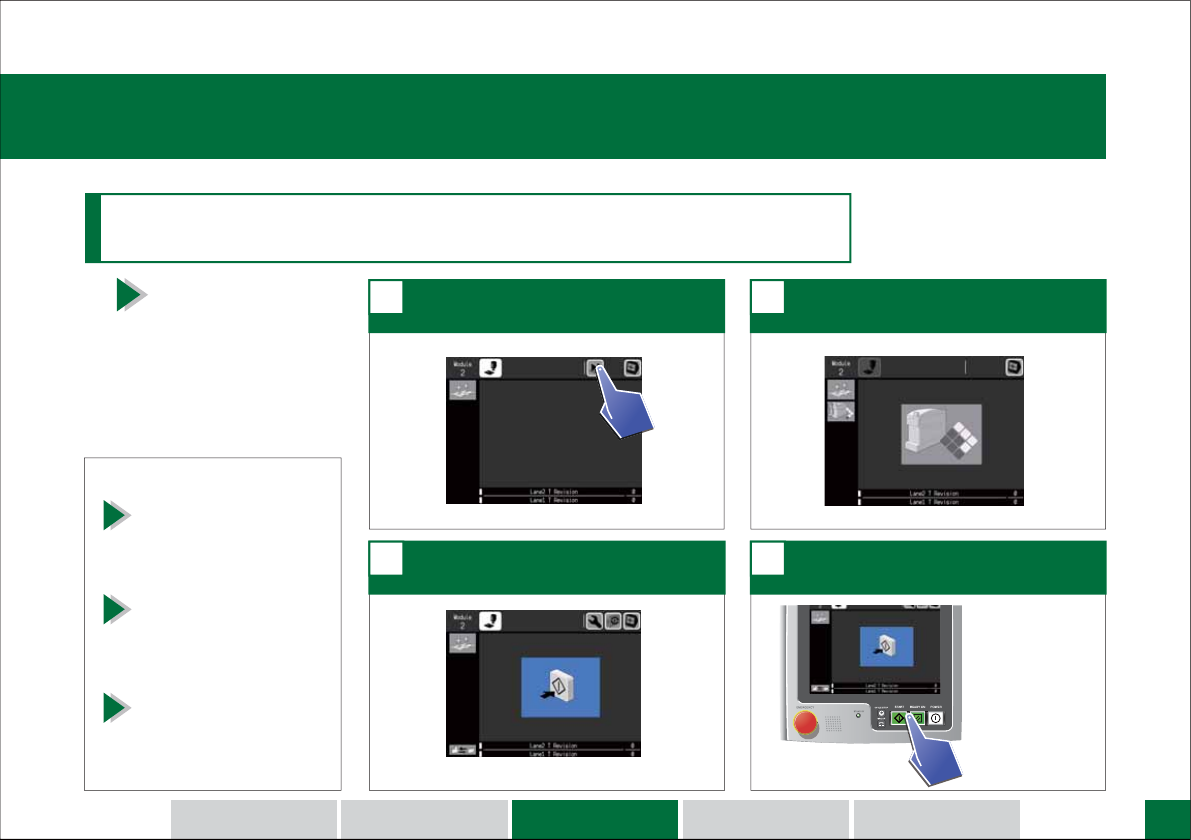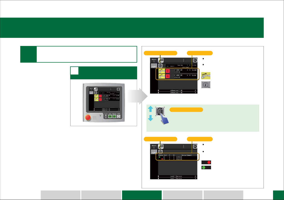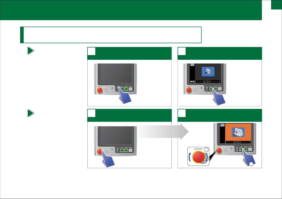 14 请按下 EMERGENCY 按钮。 1 请转动 EMERGENCY 按钮, 然后按下 ST AR T 按钮。 2 存 在3种 存在 3 种 停止生产中的 停止生产中的 机器 机器 的方法。 的方法。 请按下 CYCLE STOP 按钮。 1 请按下 ST AR T 按钮。 2 周期停止和重新运转。 2 紧急停止和重新运转。 3 1 2 机器 重新开始 生产。 机器 重新开始 生产。 机器 以动作周期 停止。 机器 随即停止。 请解…