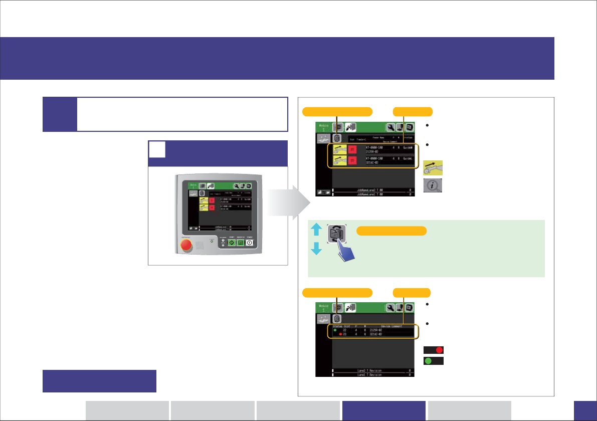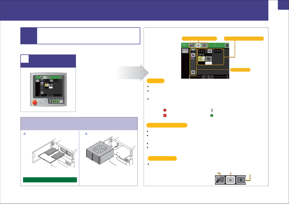 机器概要 生产准备 生 产 换 线 示意图 33 请确认向导画面。 请确认向导画面。 请确认向导画面。 STEP 1 显示需要安装元件的料槽 No. 。 需要安装元件。 显示相应料槽的供料器名、料站说明等。 显示需要安装元件的料槽 No. 。 显示相应料槽的料站说明等。 需要安装元件。 已安装的料槽信息。 〈列表显示〉 〈面板显示〉 料槽信息 料槽信息 画面切换按钮 画面切换按钮 画面切换按钮 供料器元件安装向导画面有「面板显示」和「列…